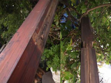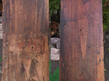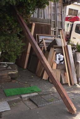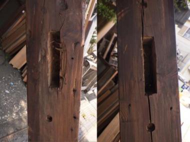 東京・亀戸の民家で使われていた古材柱です。サイズは多少のばらつきがあり、概ね2700-3000×100-105×100-105です。写真の柱は柿渋を使ってお掃除しました。