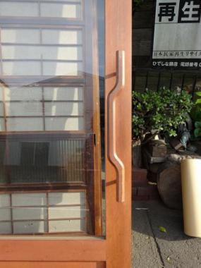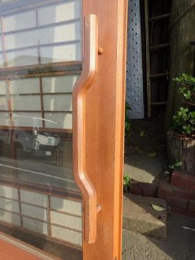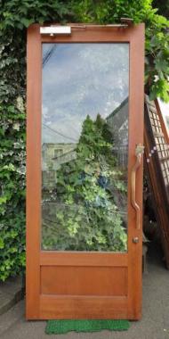 チーク材で明るく華やかな印象のドア。透明ガラス使用、規格品よりも背が高めです。都内某ギャラリーで使われていたもので、とってのデザインが可愛らしいです。