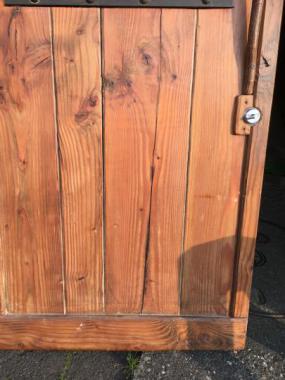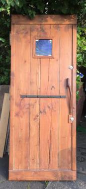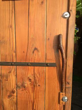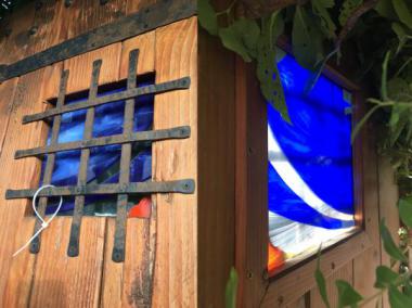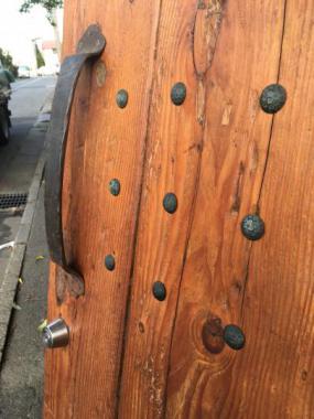 使われている金具の一つ一つのデザインが堅牢な雰囲気です。あかり窓のところにも金具の格子がついています。窓に使われたステンドグラスが良いアクセントになっています。