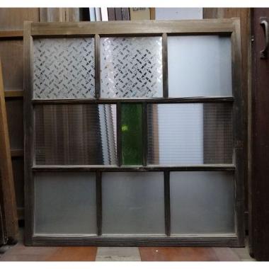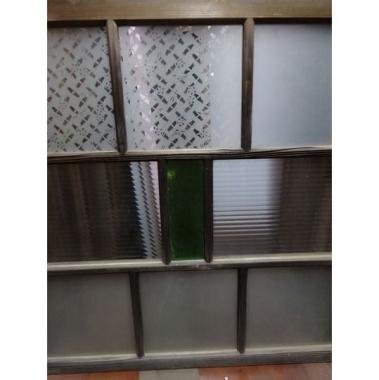 様々なガラスの模様を味わえる窓です。中央には、色付きのガラスがはめこまれています。 高さ905mm幅950mm厚み33mmです。 なお、2枚の在庫のうち一枚は、右端のガラスが破損し、 別のガラスを入れているため5000円お値引き致します。(掲載写真3枚目) 詳細お問い合わせください。