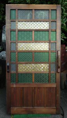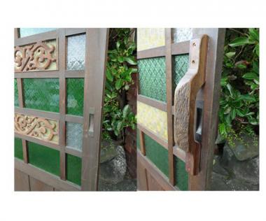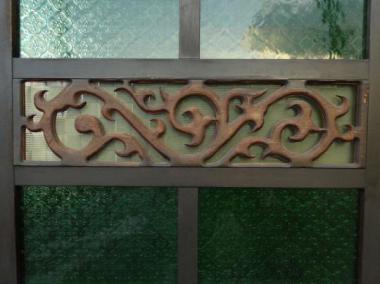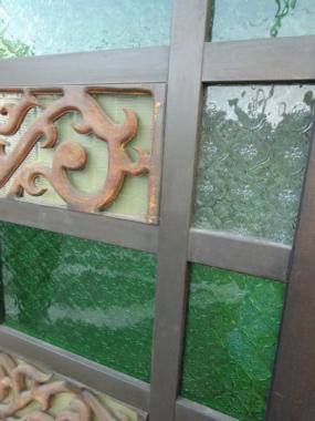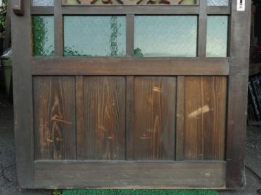 こちらの品物は2枚1組での販売になります。花柄に色がついたガラスやオーロラのような光り方をするガラスなど、凝った素材をふんだんに使った印象の戸です。中でも中央の東洋的な模様の細工は珍しく目を惹きます。