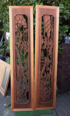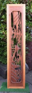 彫刻欄間でありながら、彫刻に奥行きを感じてしまいます。モチーフは近江八幡です。作者と思われる人名が彫刻されています。