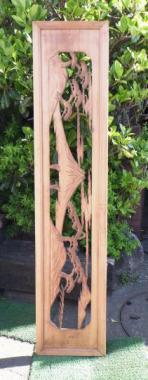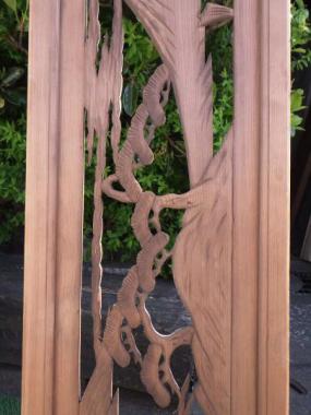 富士山が中央に堂々と据えられており、縁起の良い欄間です。彫刻装飾でありながら遠近感すら感じさせる一品です。