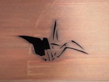 わけあり品。透し彫りに割れている箇所があるため。反りがあるため。折り鶴が控えめにちょこんと配置されていて可愛らしいです。