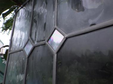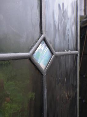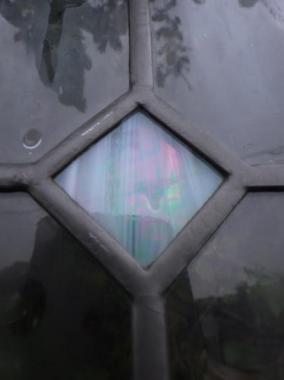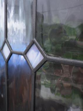 渋谷区の大正時代に建てられた古民家で使われていました。十字のところに菱形のキラキラ光る装飾がついています。一つ一つが神秘的な光り方で思わず見とれてしまいます。透明な部分も有機的に波打っており、一言で言い表せない美しさです。