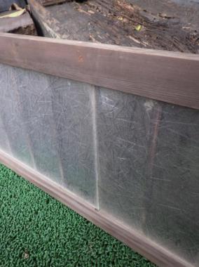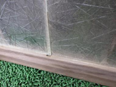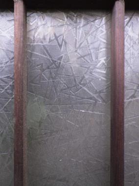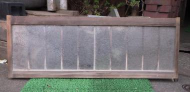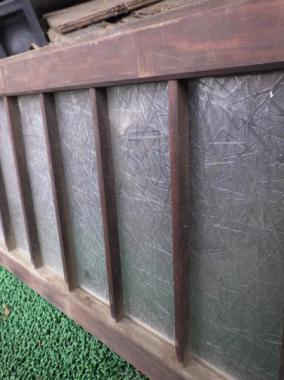 わけあり品。裏面のガラスの境にあるはずの桟が無くなってしまっているため。さんかくが幾重にも重なったような最近では見かけない懐かしい感じの模様ガラスが使われています。
