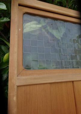 明かり窓には、スクエア型の模様ガラスが使われており、和洋どちらの空間にも馴染みがよさそうです。板の張り方もあえて凹凸を作っています。縦框30mmです。