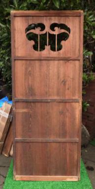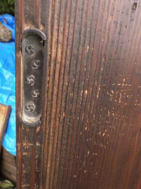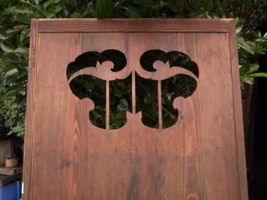 わけあり品。板枠と引き手に傷みが見られます。釘が外れている箇所もあります。なぜこんなに開口部が大きいのか分かりませんが、雪隠戸としては大胆な意匠で珍しいです。