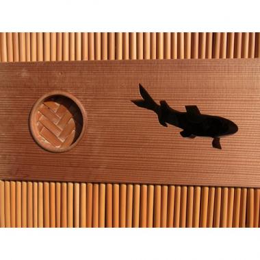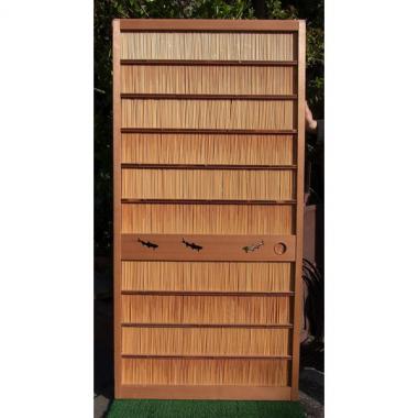 素材は杉です。サイズは、高さ1,784mm幅865mm厚み31mmです。鯉が漂う、粋なデザインです。引き手にはアジロになっています。 詳細、御問い合わせください。