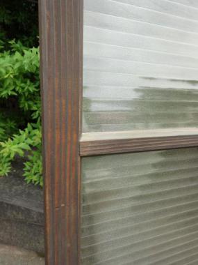 葛飾区の民家で使われていたものです。背が低いガラス戸です。窓としても使えるかと思います。梨地で横縞のモールガラス下三段に入っています。一番上は透明です。