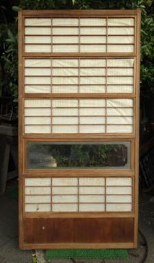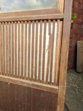 わけあり品。格子に割れている箇所があるため。横額には縁の模様がついたガラスがはめ込まれています。全体的に落ちついた色味。腰板と枠のコントラストには調和があり、丁度良い風合い。