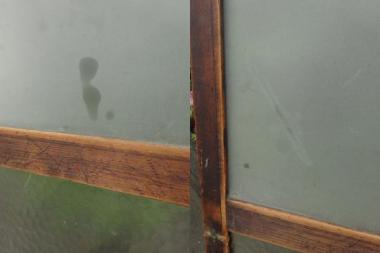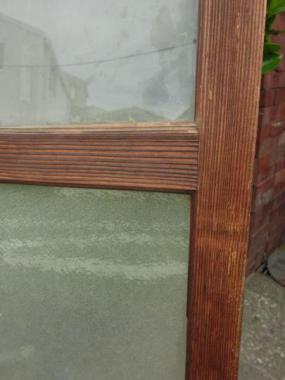 わけあり品。ガラスに汚れがみられるため。最近のデザインでは見られないガラスの組み合わせです。上段が曇りから透明のグラデーションです。下段は水玉の鱗のような模様ガラスです。在庫のうち1枚だけ下段ガラスが梨地です。葛飾区の民家で使われていたものです。