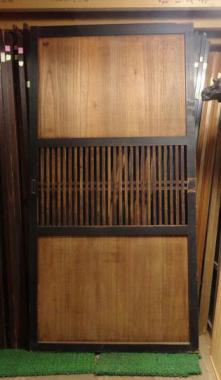 わけあり品。腰に隙間がある等、傷んでいる個所があるため。黒い枠と素の色の板の組み合わせが粋です。腰板には桐が使われています。和の雰囲気が演出しやすい建具です。