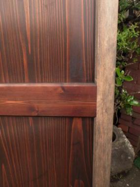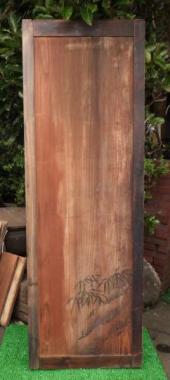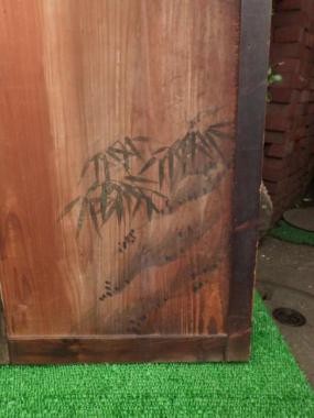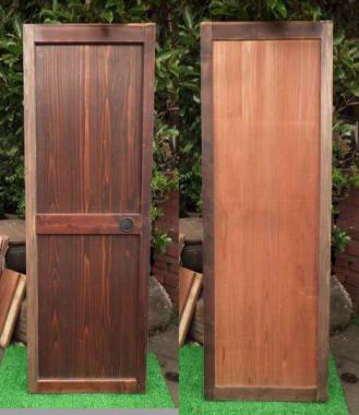大きな戸を二分割して作り変えました。ぞれぞれ片側の縦桟が新しい材で、柿渋を塗装して調子を整えてあります。在庫のうち一枚は、笹の絵が付いています。