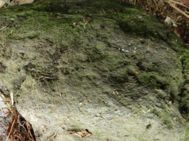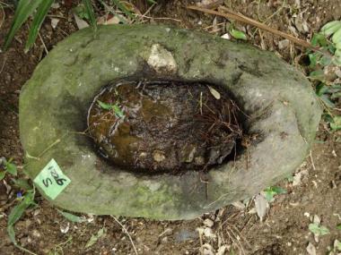露地の中で万物のかげろいを感じられそうな仙人みたいな雰囲気のつくばいです。苔の付き具合、おうとつ、皺、どれにつけても通を喜ばせそうなひととなり。水を溜める所は300×180×70です。