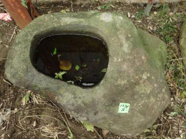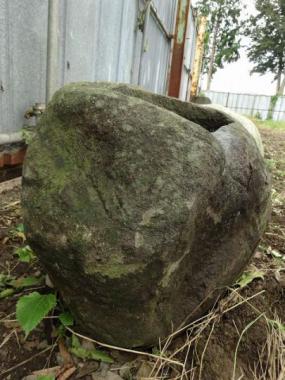 自然の石のかたちを生かしたつくばい。もともと置いてあった場所の陽のあたり加減によるものでしょうか、かたちに沿って所々、お化粧するように程よい苔の表情。すでに風情十分といえるでしょう。水が溜まる所は楕円のかたちになっており大きさは360×260×140です。