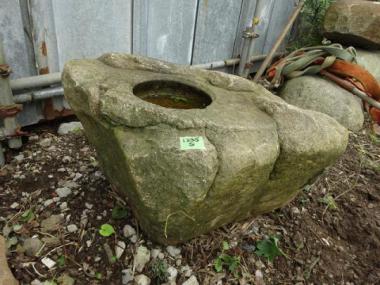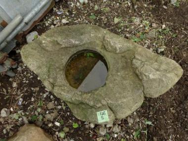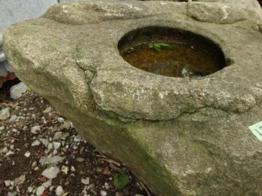 どの面から見ても面白い形が浮かび上がってきます。角は立っていないけれど、どことなく岩のような風情。いつまでたっても新鮮味を失わないような不思議な雰囲気をまとったつくばいです。水が溜まる所は、直径230×深さ100です。