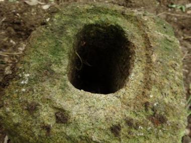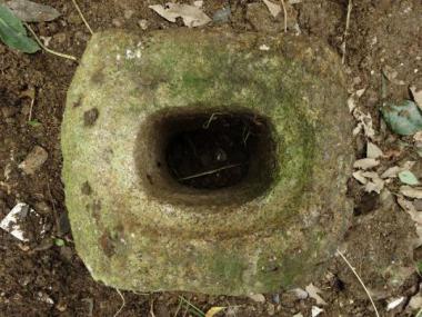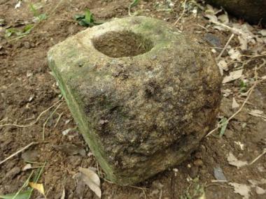 穴が貫通している石です。灯篭の部材だったと思われますが、どちらかの穴を塞いでミニつくばいとして使われてみても面白いと思います。なんといっても小さくコロンとした愛らしい形状に思わず親しみを覚えることでしょう。