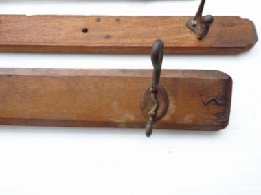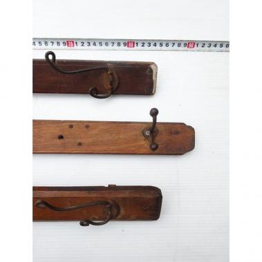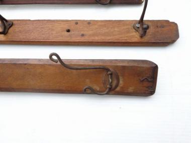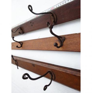 板に4つのフックがあります。経年変化した材木付きですので、アンティークの雰囲気をより感じることができる一品です。 一枚目の写真の上から順に 高さ57mm幅850mm厚み(フック横幅)90mm 高さ50mm幅908mm厚み(フック横幅)60mm 高さ50mm幅835mm厚み(フック横幅)100mmの大きさです。 詳細お問い合わせください。