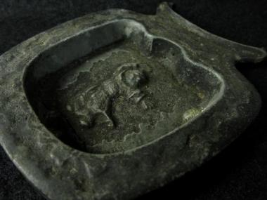 壺の中に小人が入っているかのような不思議なイメージです。人のポーズもちょっと奇妙で意味深。かといって不気味さはなく何となくチャーミングな雰囲気があります。小人の足の下あたりにひび割れがあります。