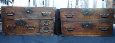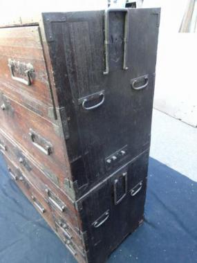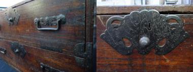 金具の文様のモチーフに藤が使われているようです。刀を入れる箪笥として使われていたもので、一家の貴重品を預けるのに相応しい立派なつくりです。材はシオジや桐がつかわれています。正面には特に素材の自然な艶が出ており、気品があります。上下段組の販売になります。下段の左下の引き出しは、鍵がかかっており開きません。上段の高さ:540mm 下段の高さ:535mm