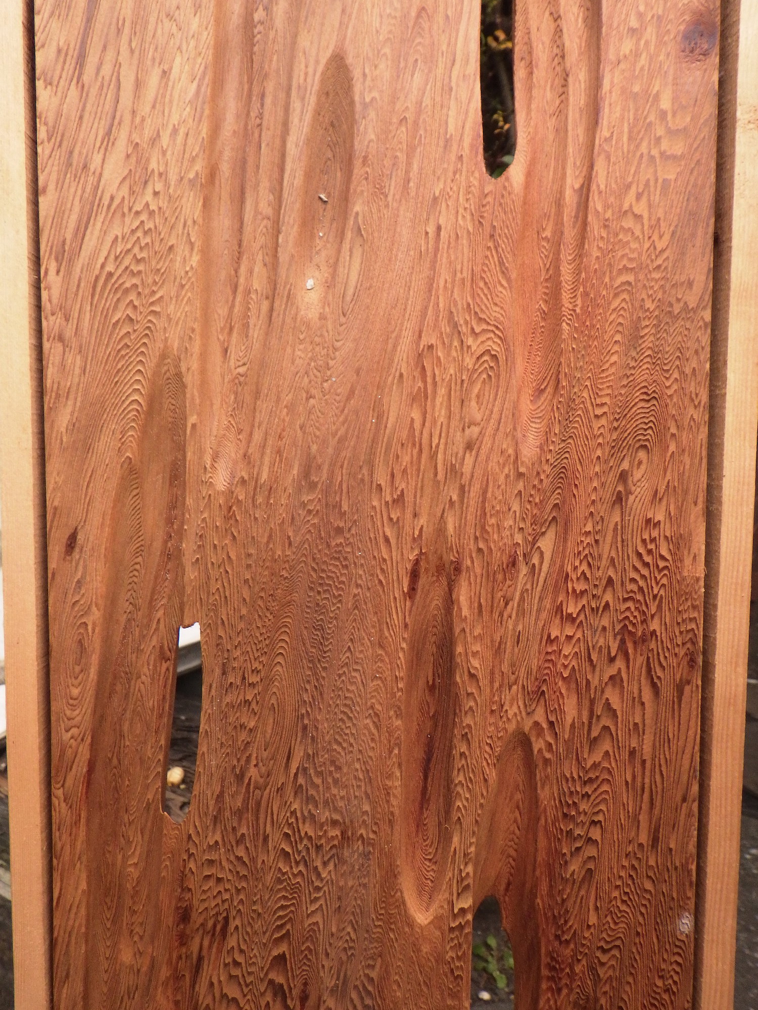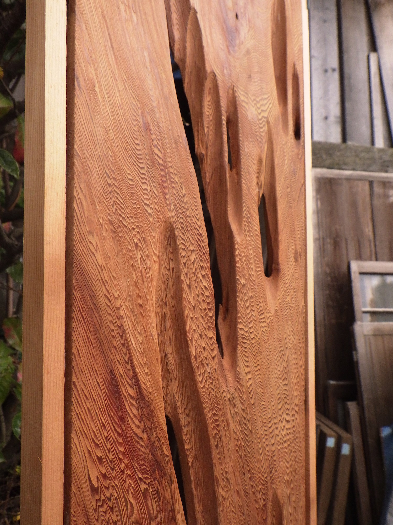 小田原の民家で使われていたものです。持ち主の話では屋久杉ではないかということでした。木目の入りかたに思わず見入ってしまう一品です。