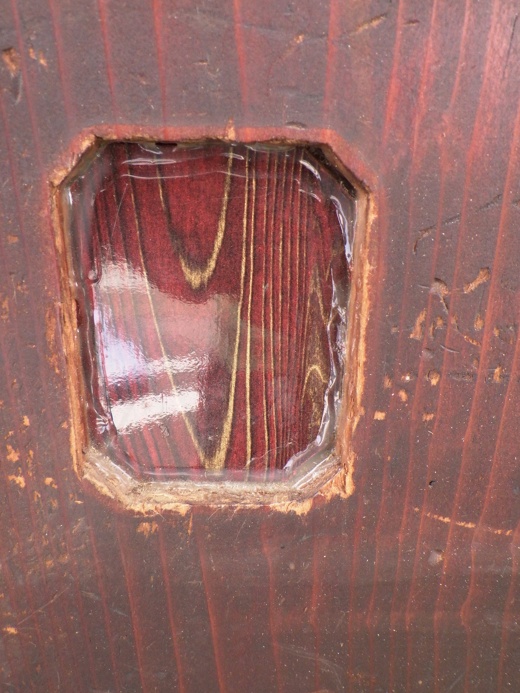 わけあり品。引き手は嵌め込まれておらず、木目調のデザインになっています。割れている箇所やキズが見られるので要修理のお品物です。埼玉の深谷の民家で使われていたものです。