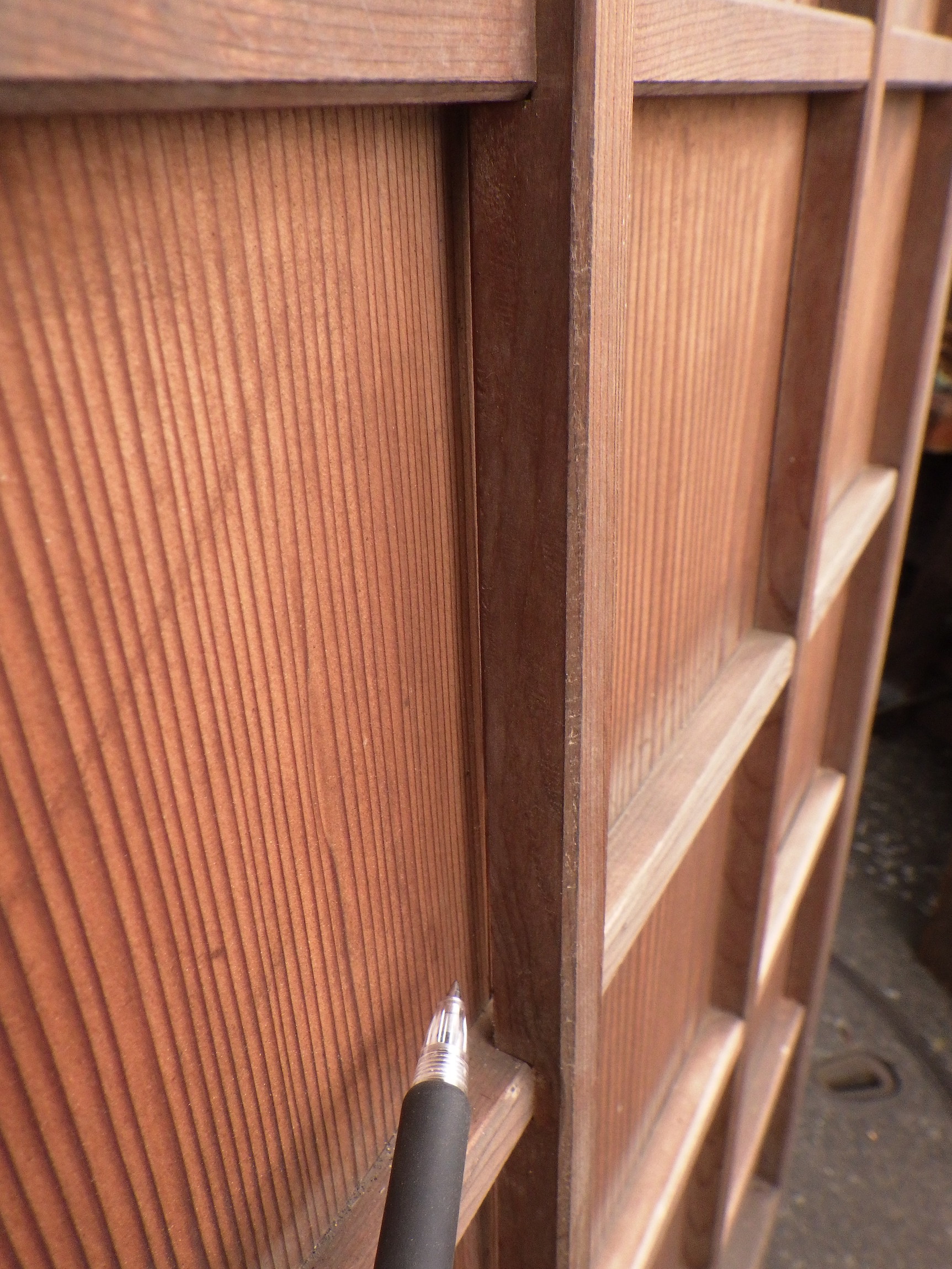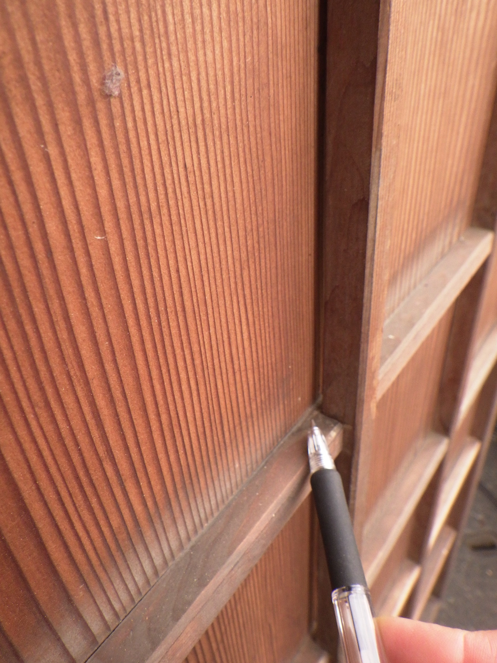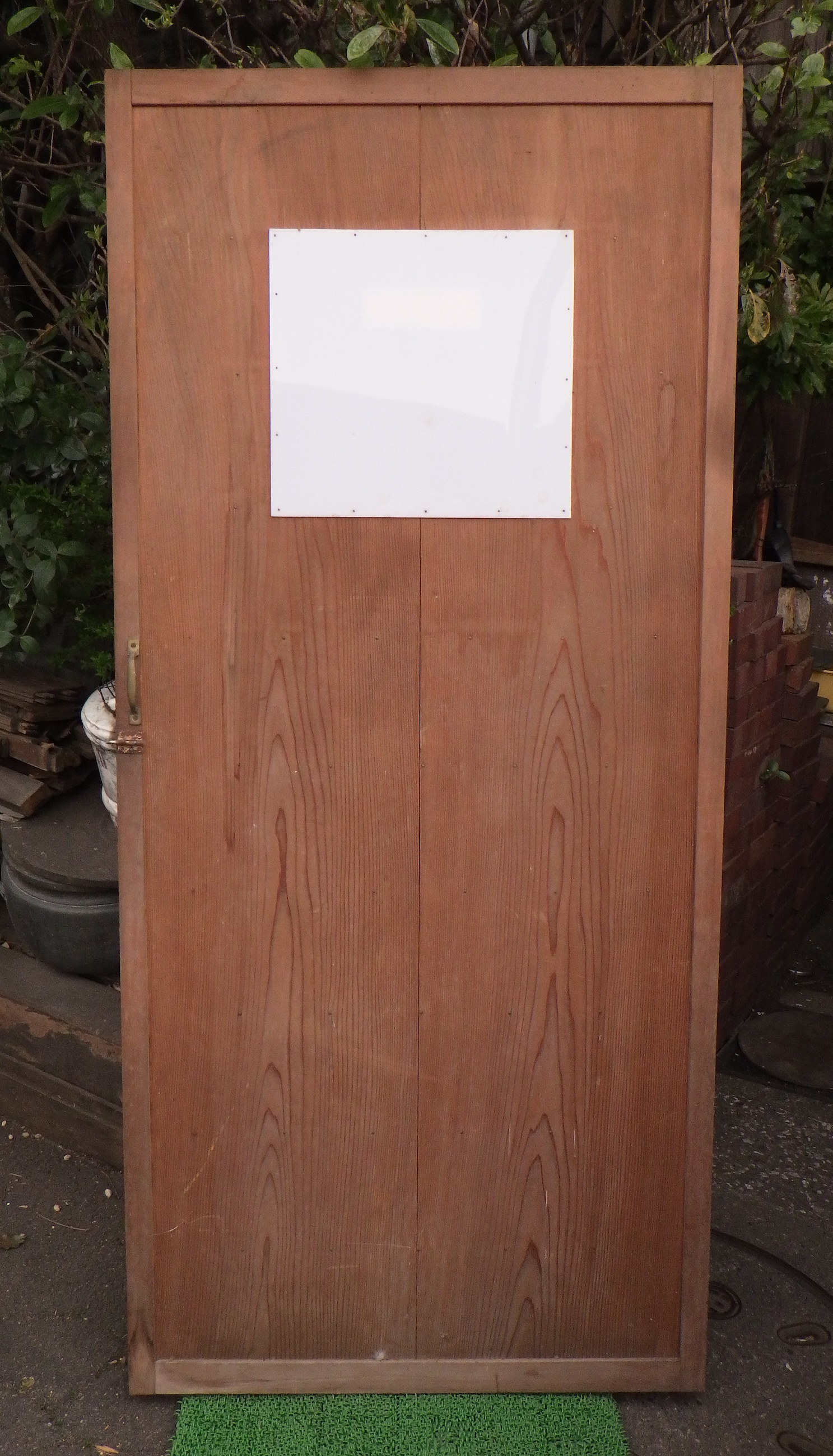 わけあり品。格子の一部に浮いている箇所がございます。格子窓には白いプラスチックの板が釘打ちされています。取っ手の下にスライド式の小さな鍵がついています。