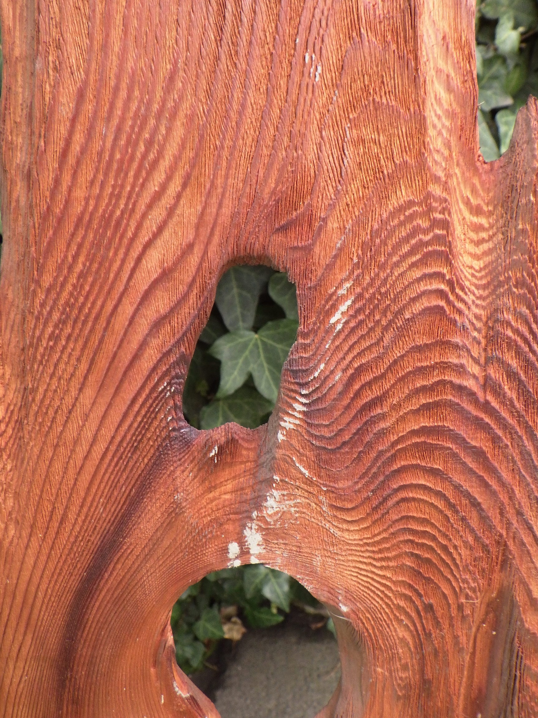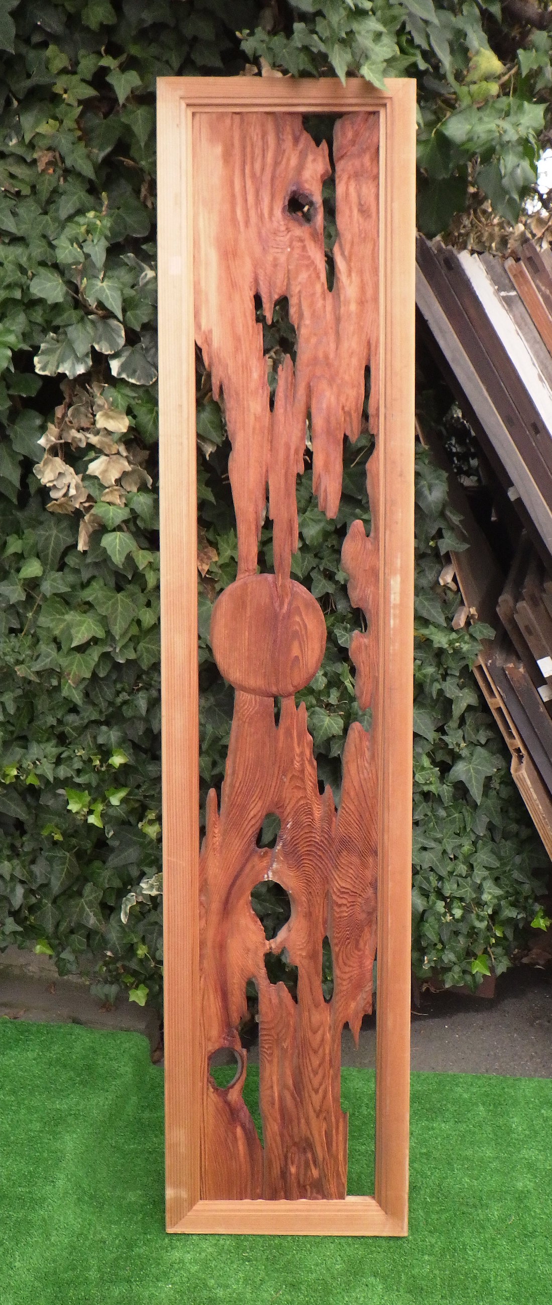 月夜のような日の丸のような曖昧さから想像が広がる不思議な板欄間です。自然が形成した木目やおうとつに迫力があります。多摩の民家で使われていたものです。