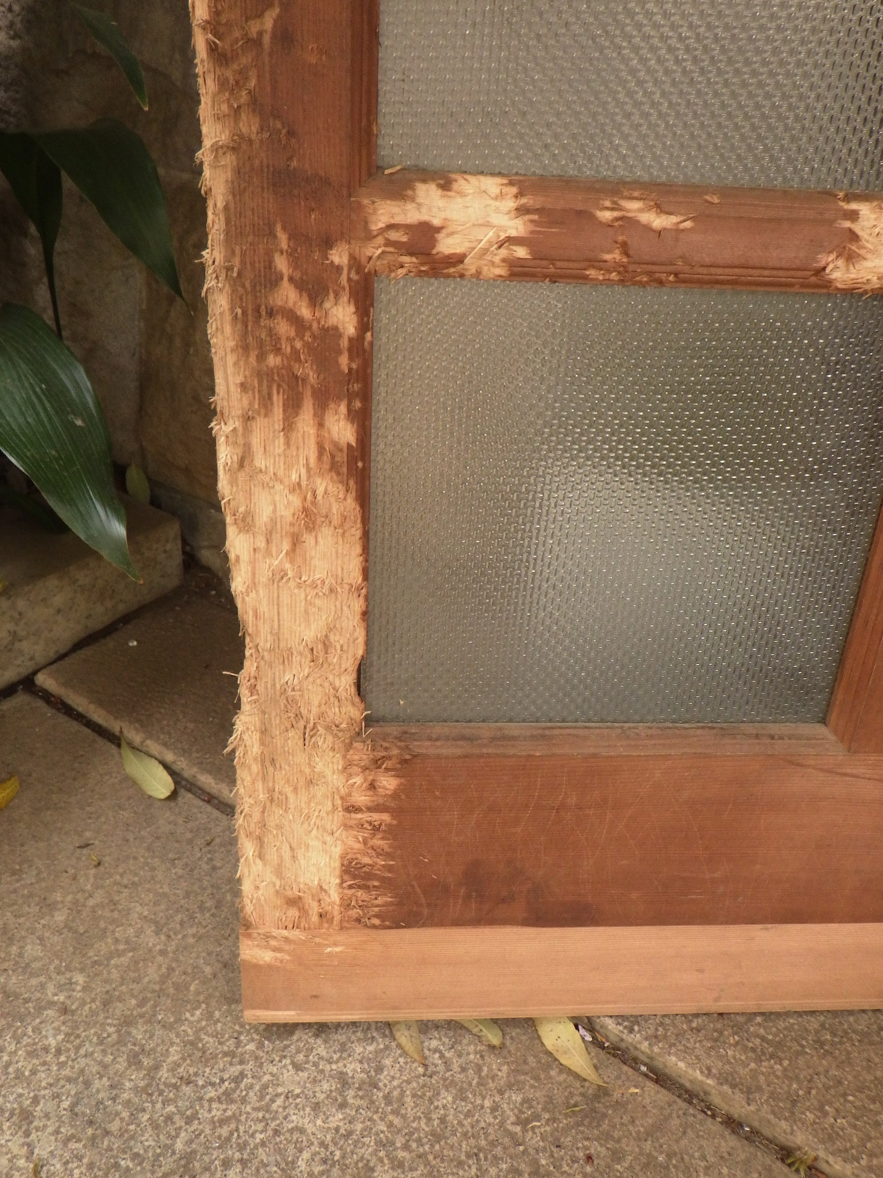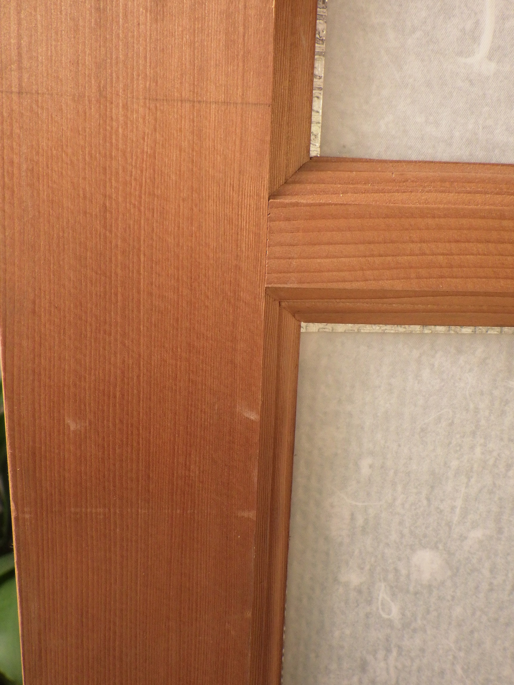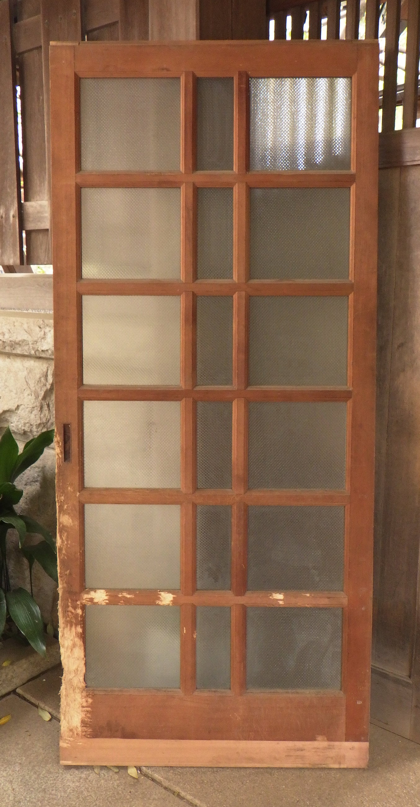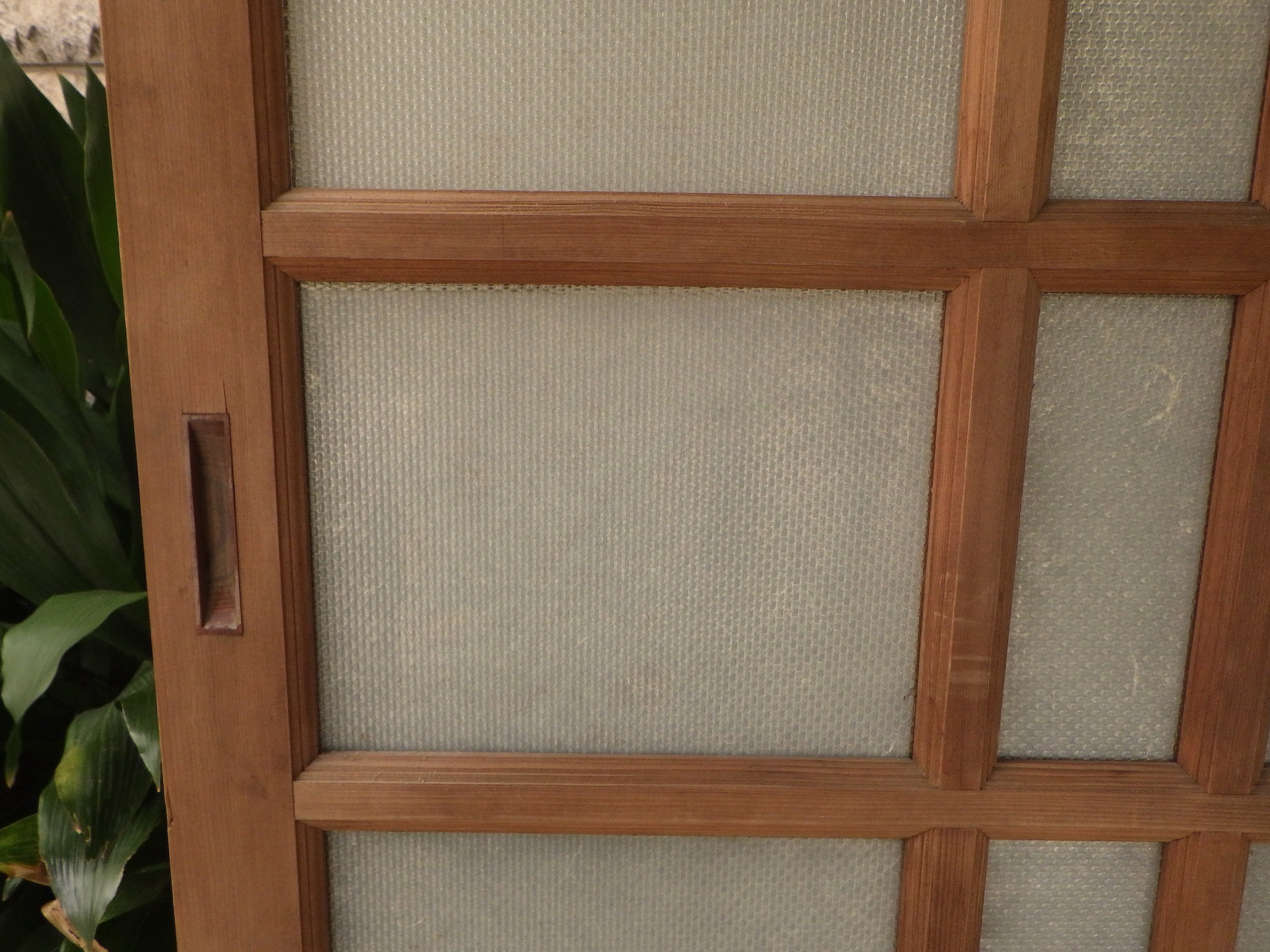東京の世田谷区の民家で使われていたものです。ダイヤガラスが使われていますが、片面に和紙風の目隠しシートが貼り付けられています。在庫のうち2枚は幅が910mmで桟に傷みがあるため、価格は半額となります。
