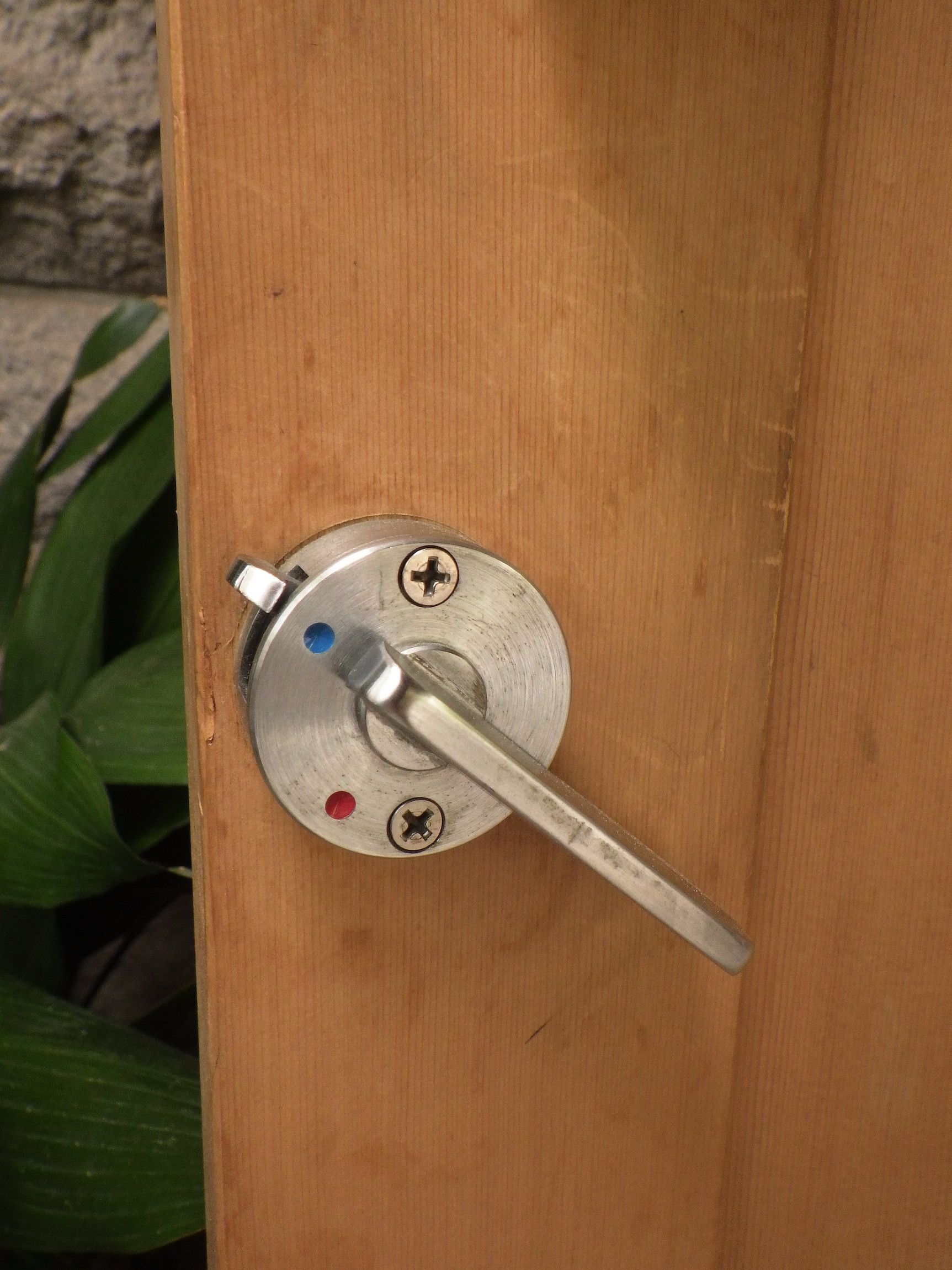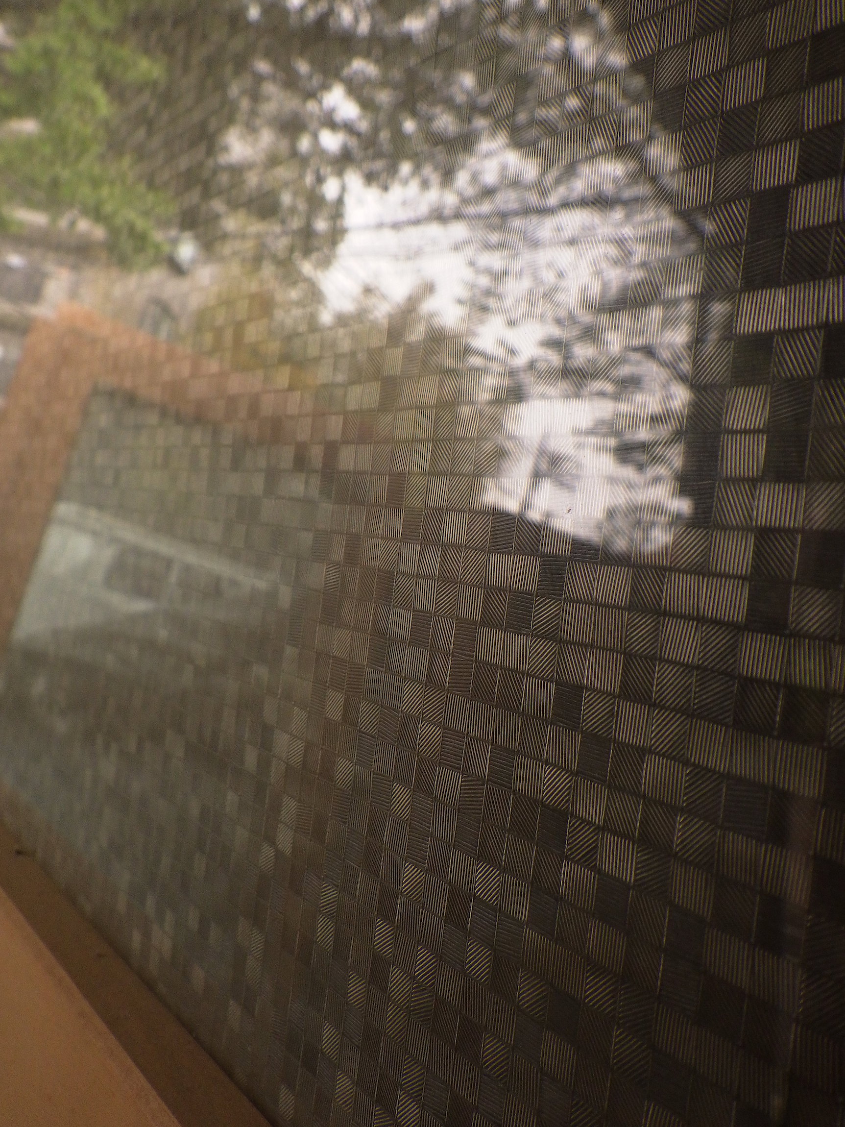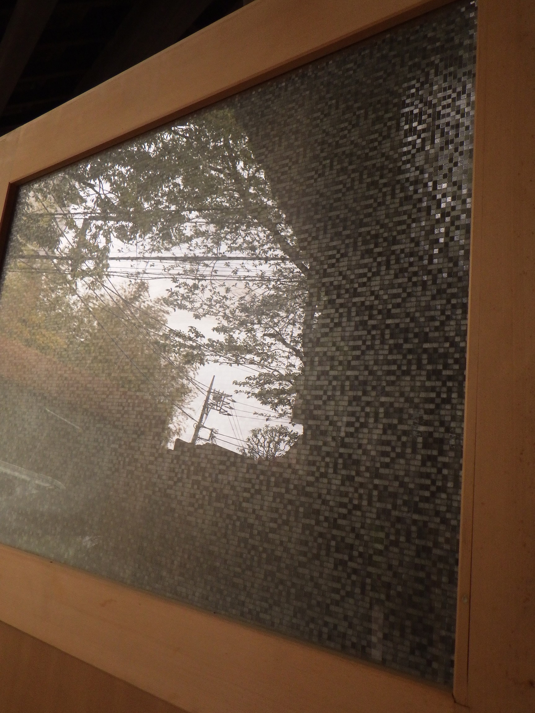 取手付きの腰高ガラス戸です。模様ガラスはスクエアが連なったモダンなデザインのものが使われています。大きなわかりやすい鍵もついています。高さもありますので店舗のリノベーション等にもお使い頂けそうです。