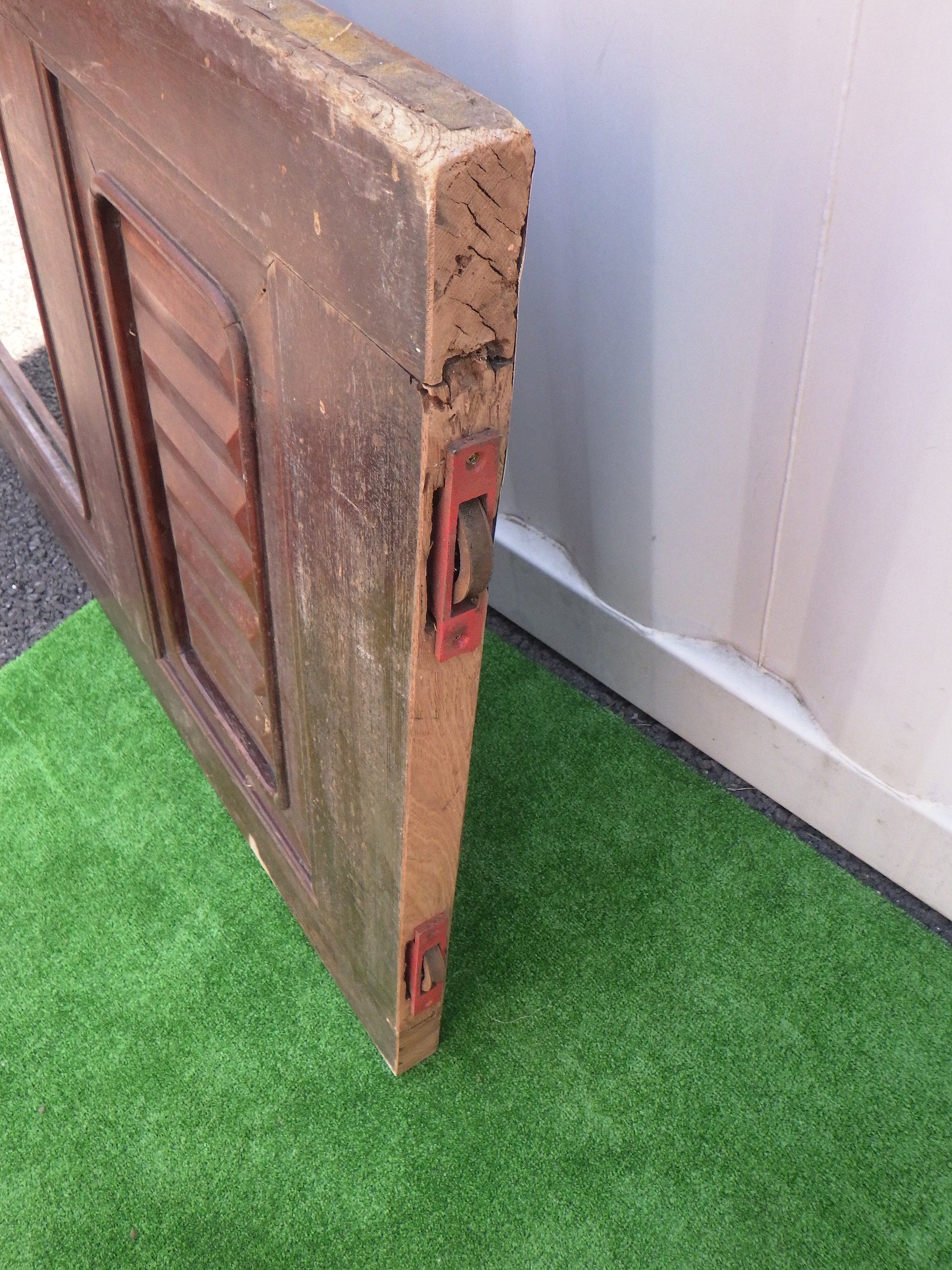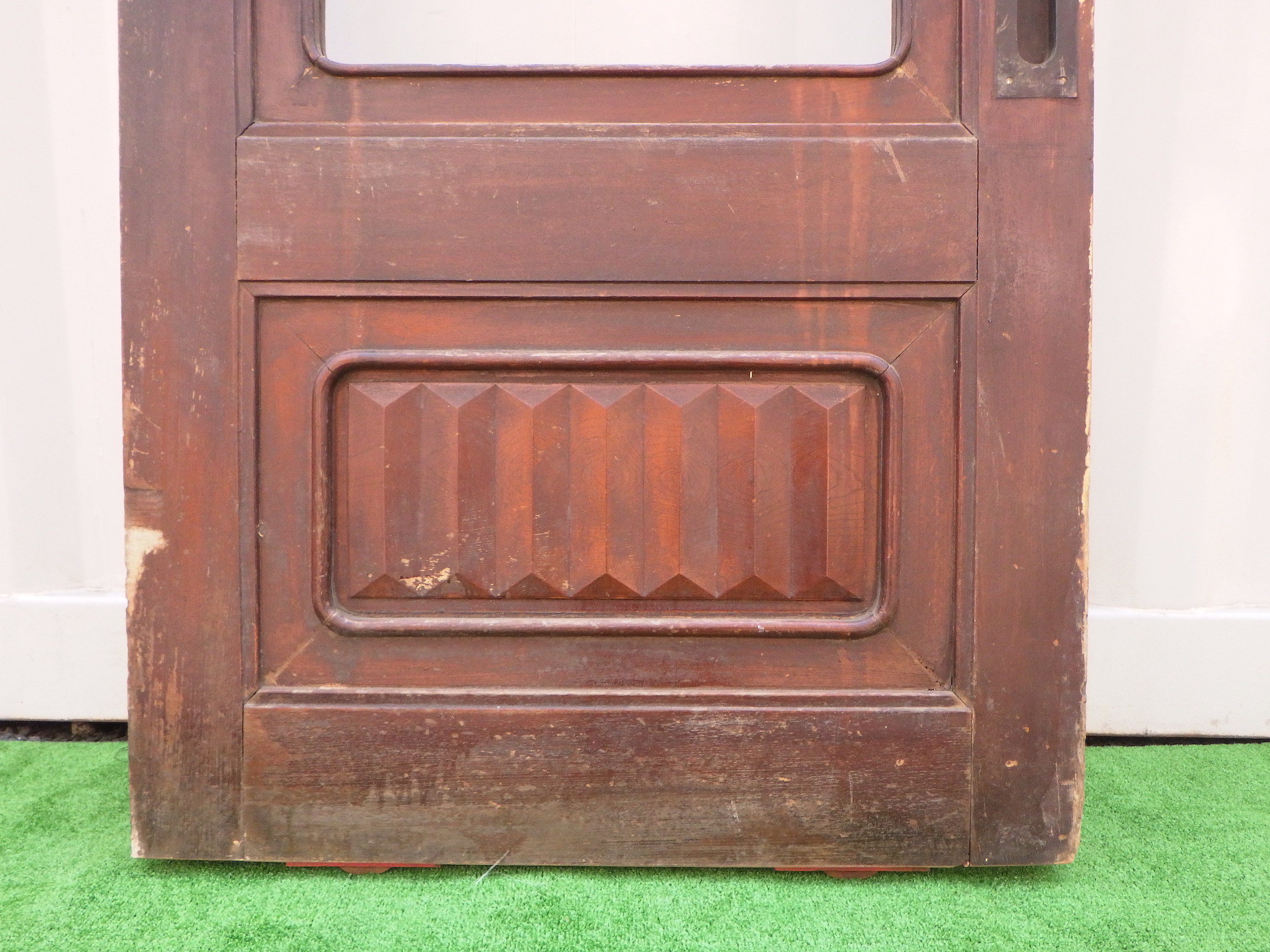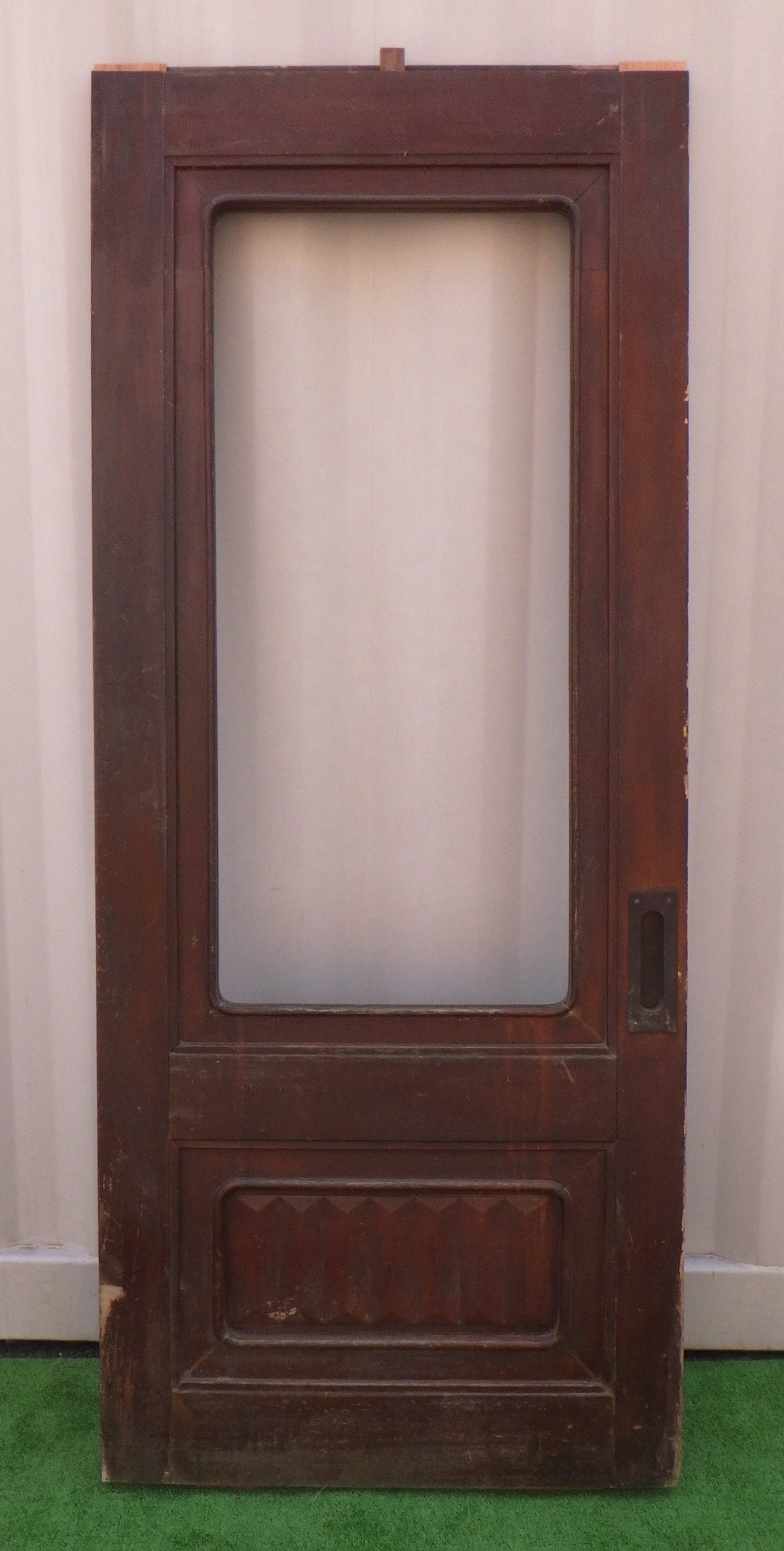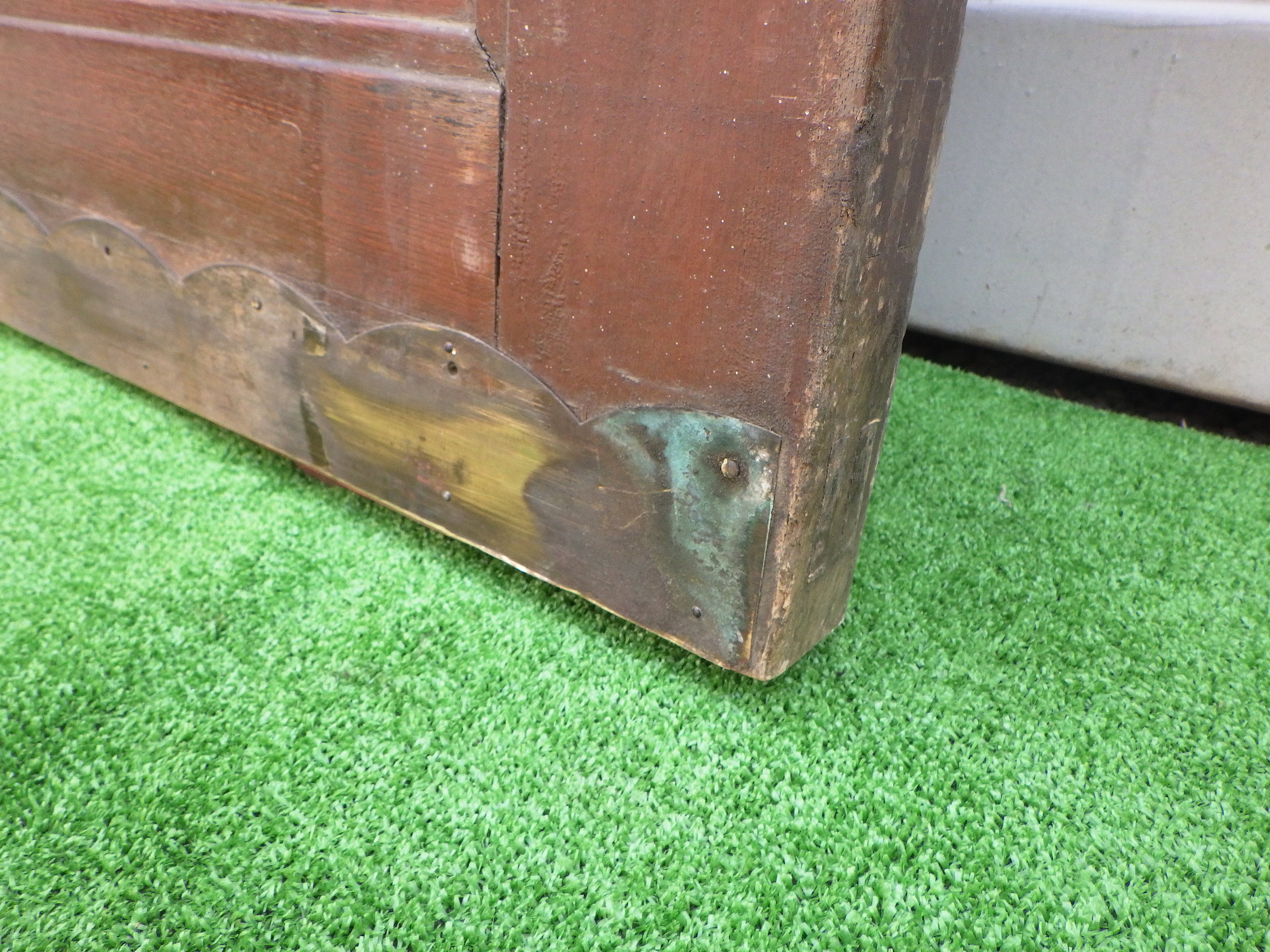 腰付きガラス戸です。引き戸にも関わらず洋風ドアのような印象があります。重厚で凝ったデザインです。窓が大きいので店舗の入り口などの設置にもおすすめです。片面、腰下に金具の装飾がついています。