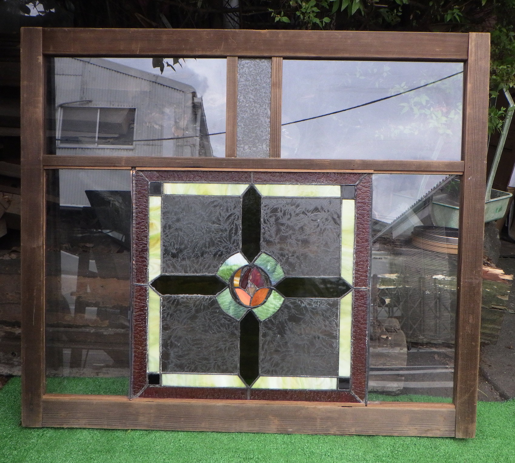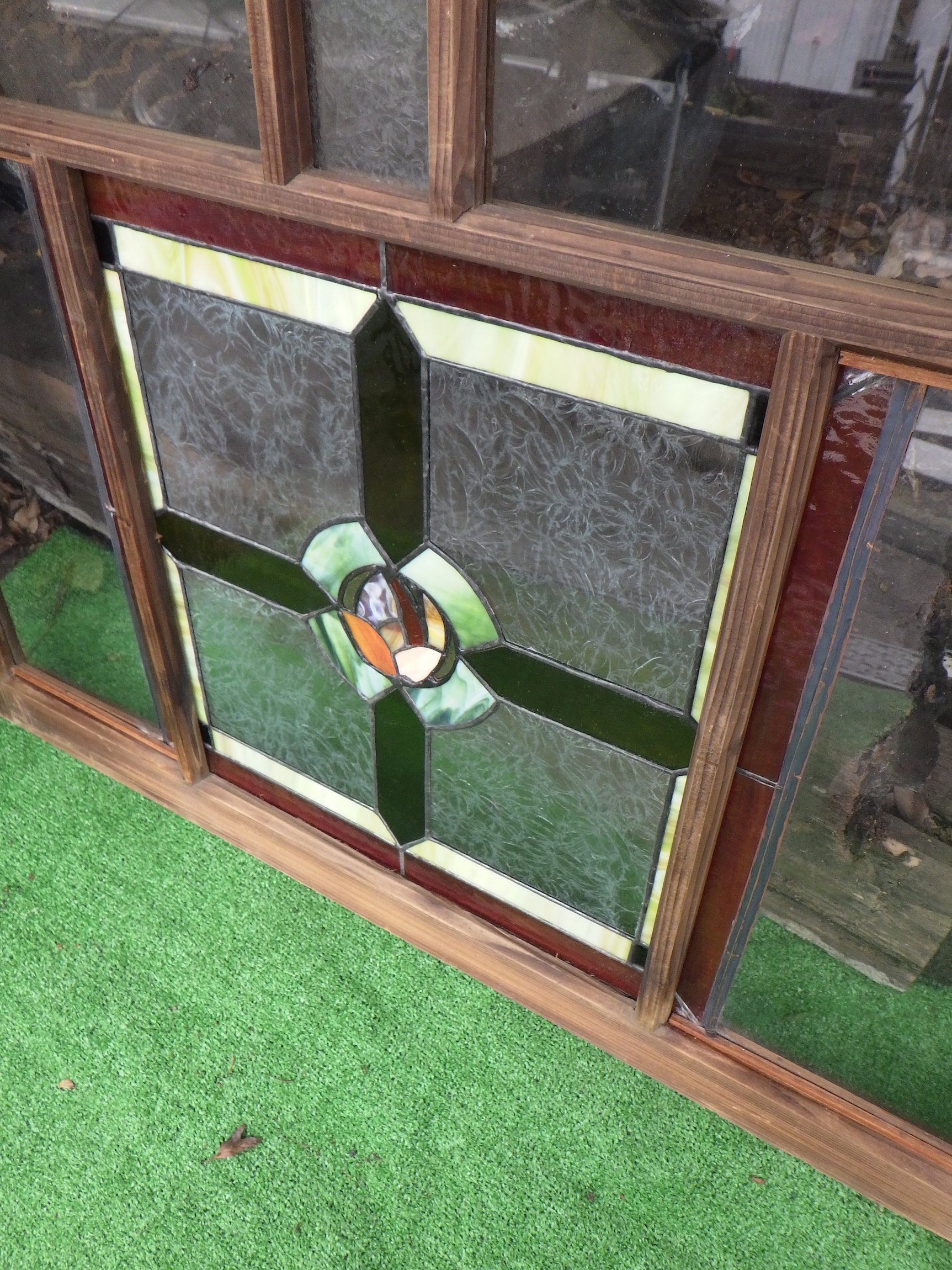 メインの緑とオレンジのカラーでは様々な種類のガラスが使われており、味わい深くどこか神聖さも感じる絵柄。それぞれの色の中にもいろいろなトーンが感じられるため、見飽きることがありません。