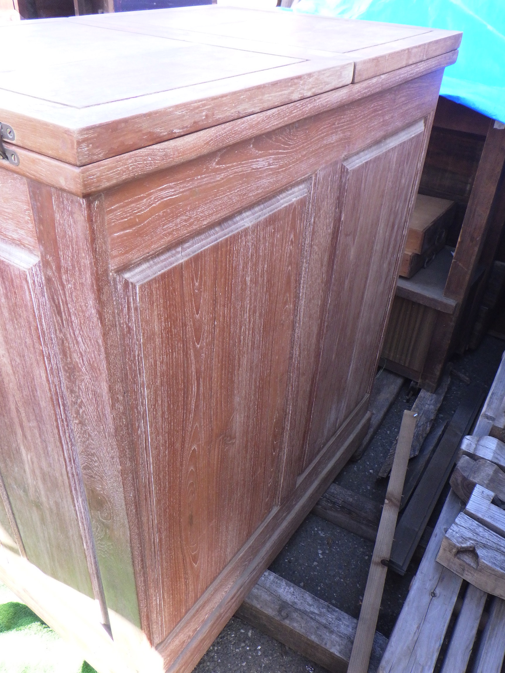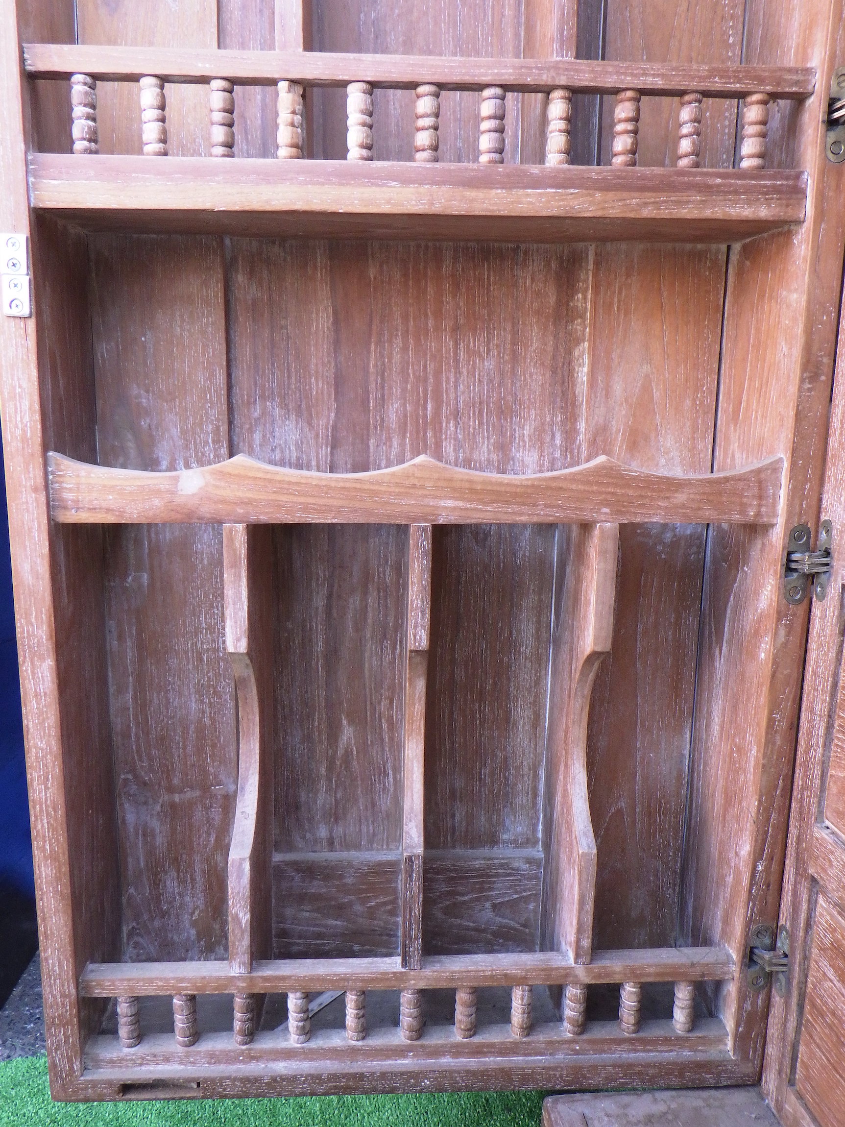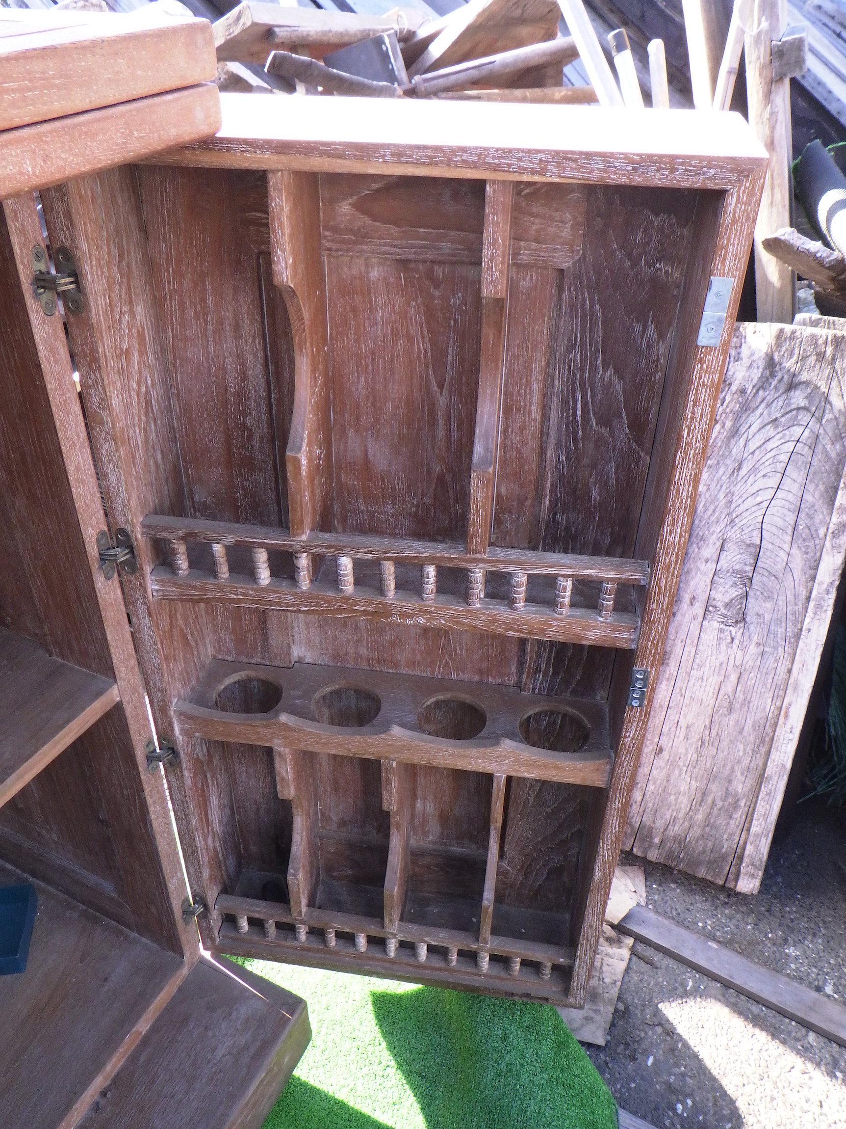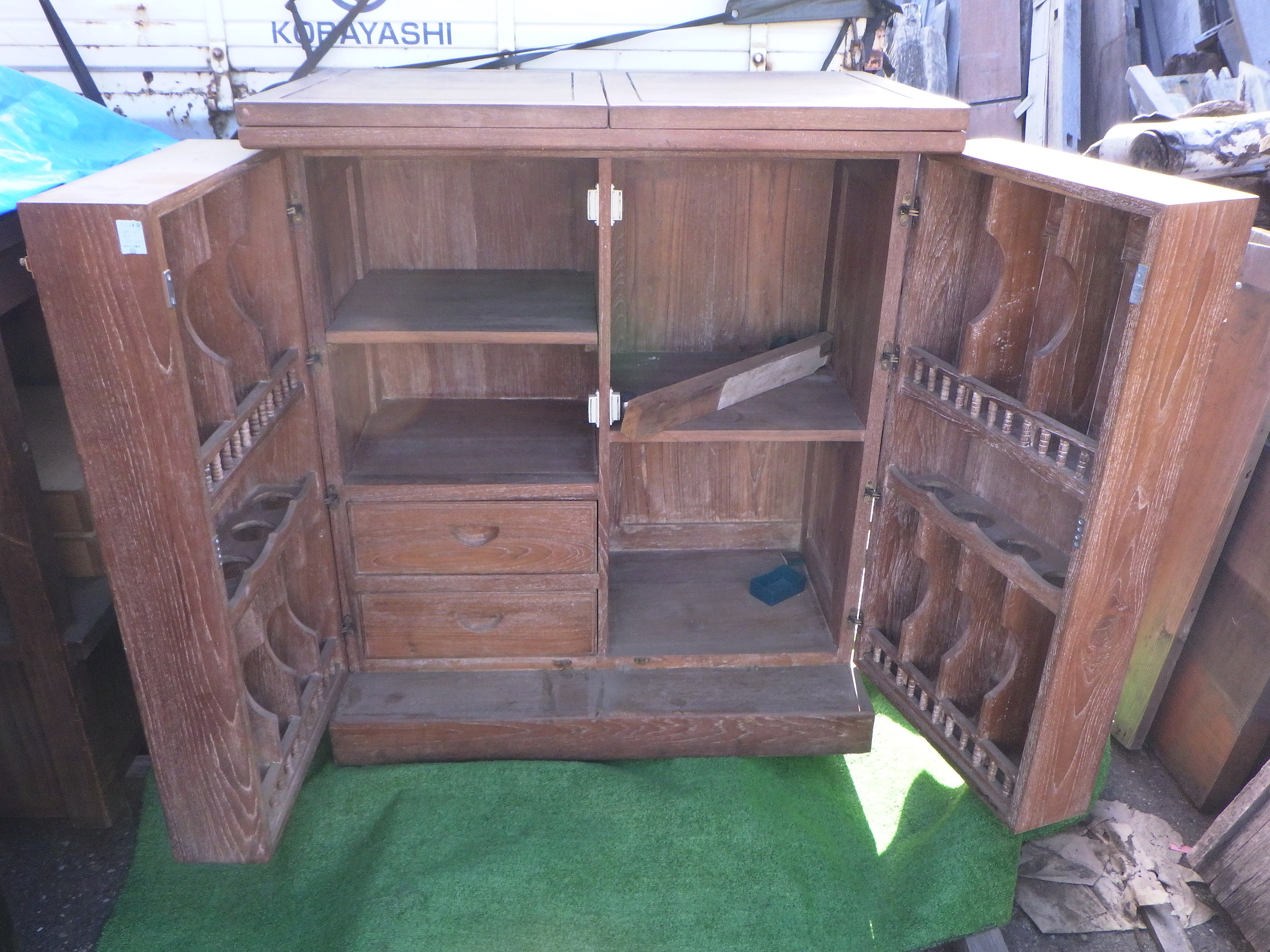 一見、戸棚のようですが、重厚な扉を開けると何本もワインをしまえる収納庫になっています。材質はおそらくチーク材と思われます。ただしまい込むのではなく、見せる収納のデザインになっているところがニクいです。天板は左右にひらきますのでちょっとしたテーブルのように使うこともできると思います。(開くと1825mm)素材にしても、デザインにしてもちょっと珍しいお品と言えそうです。