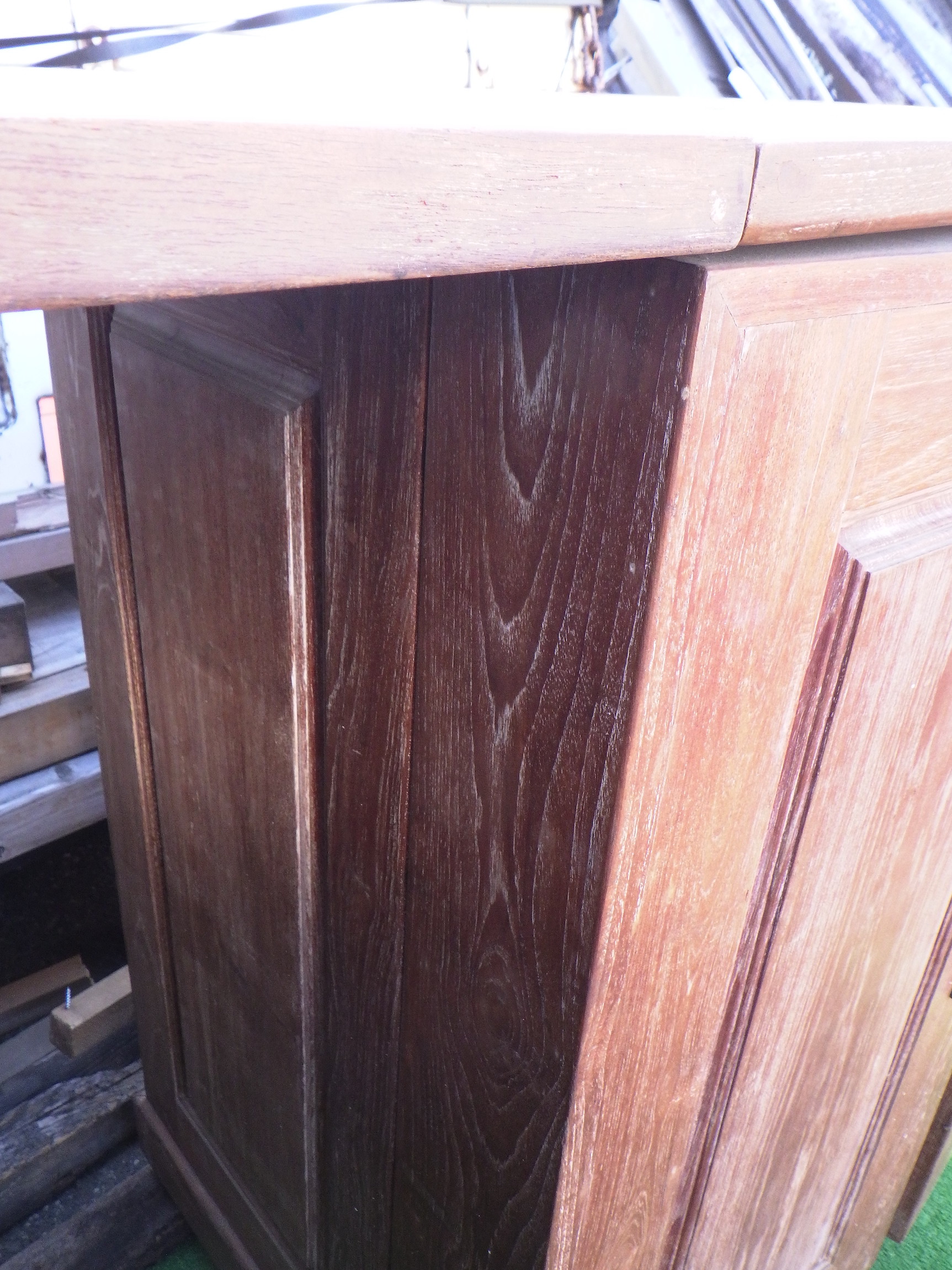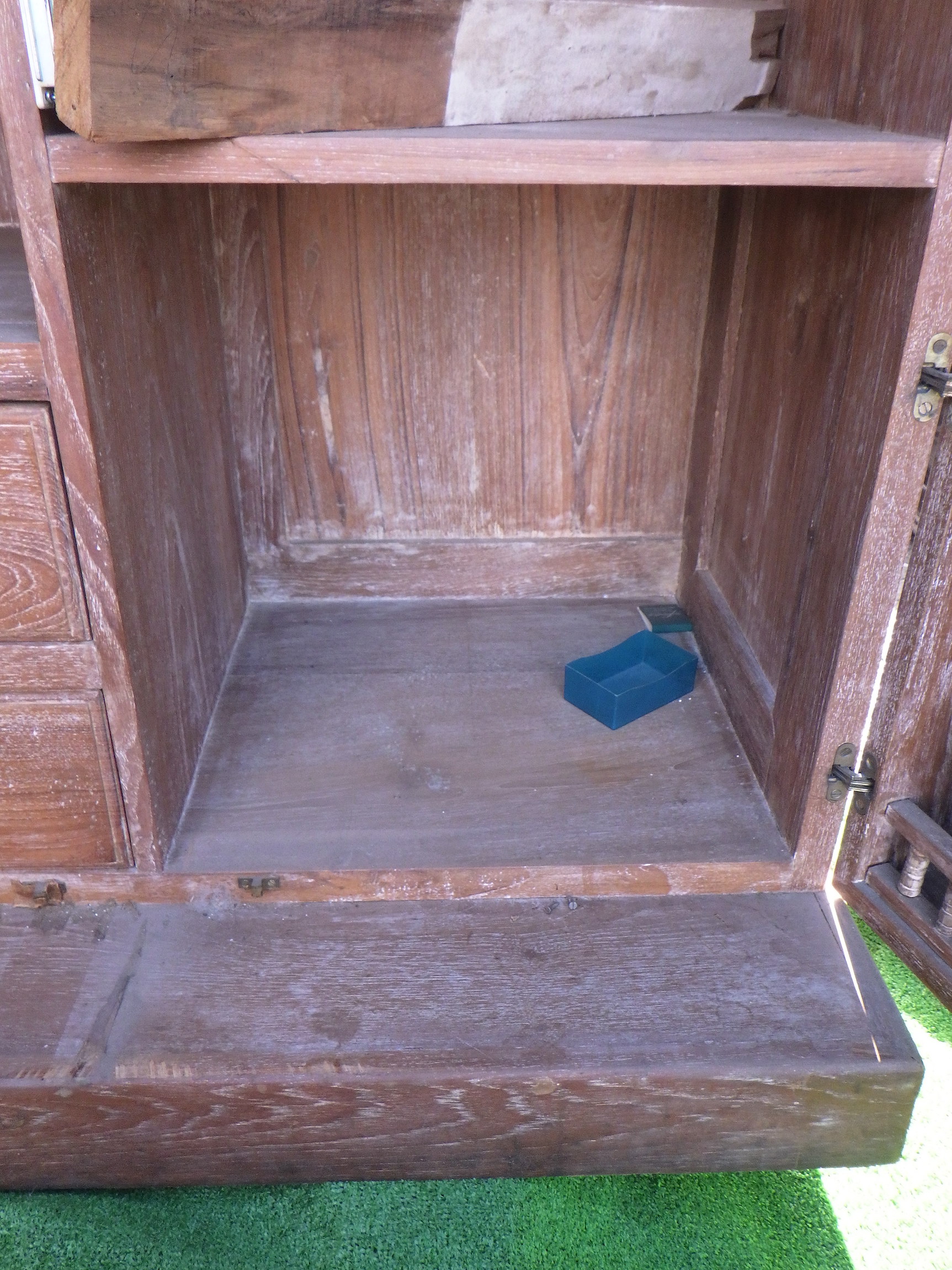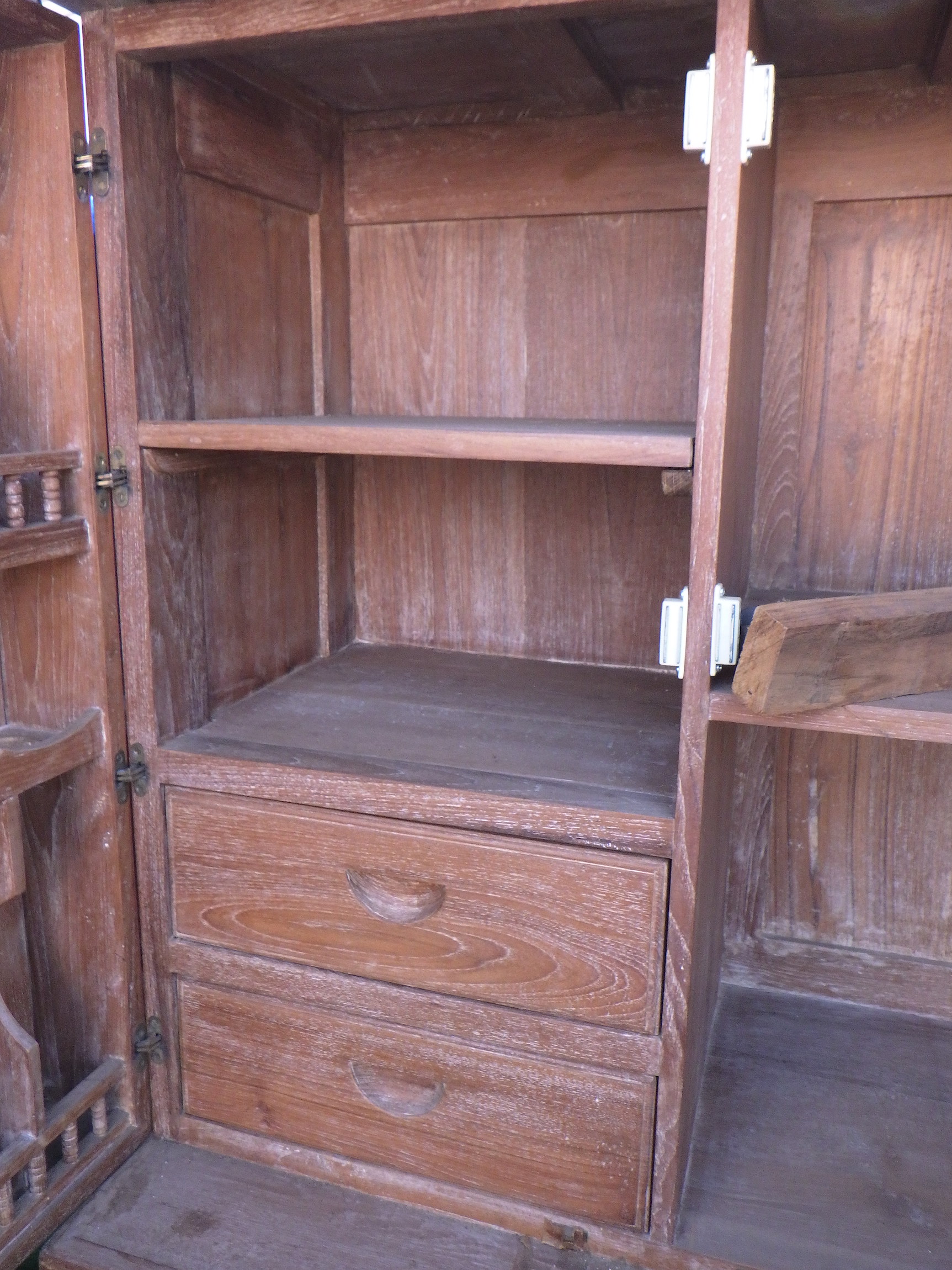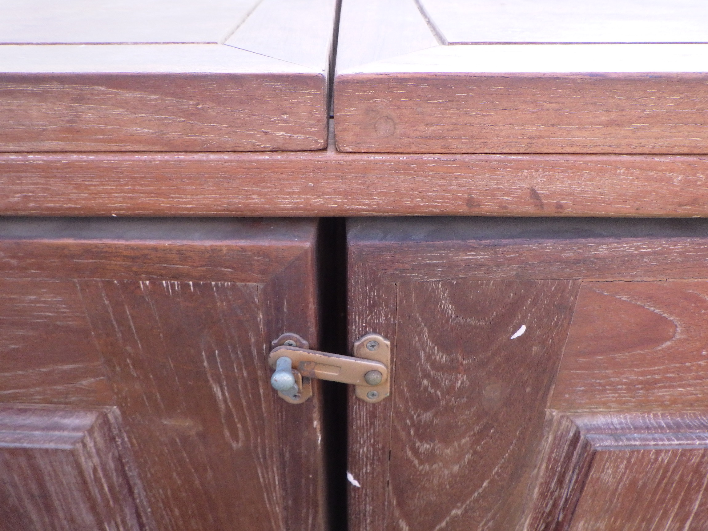 一見、戸棚のようですが、重厚な扉を開けると何本もワインをしまえる収納庫になっています。材質はおそらくチーク材と思われます。ただしまい込むのではなく、見せる収納のデザインになっているところがニクいです。天板は左右にひらきますのでちょっとしたテーブルのように使うこともできると思います。(開くと1825mm)素材にしても、デザインにしてもちょっと珍しいお品と言えそうです。
