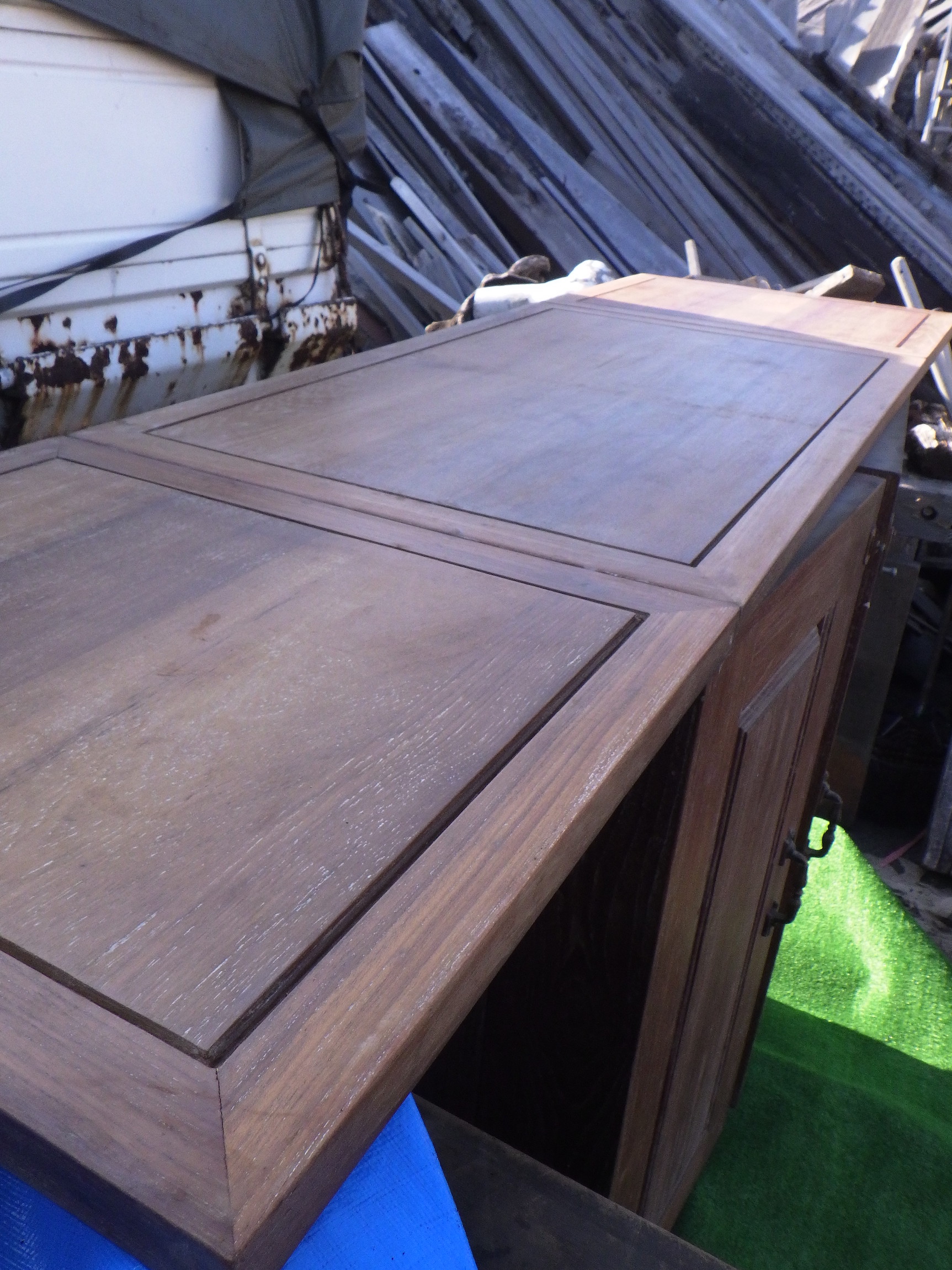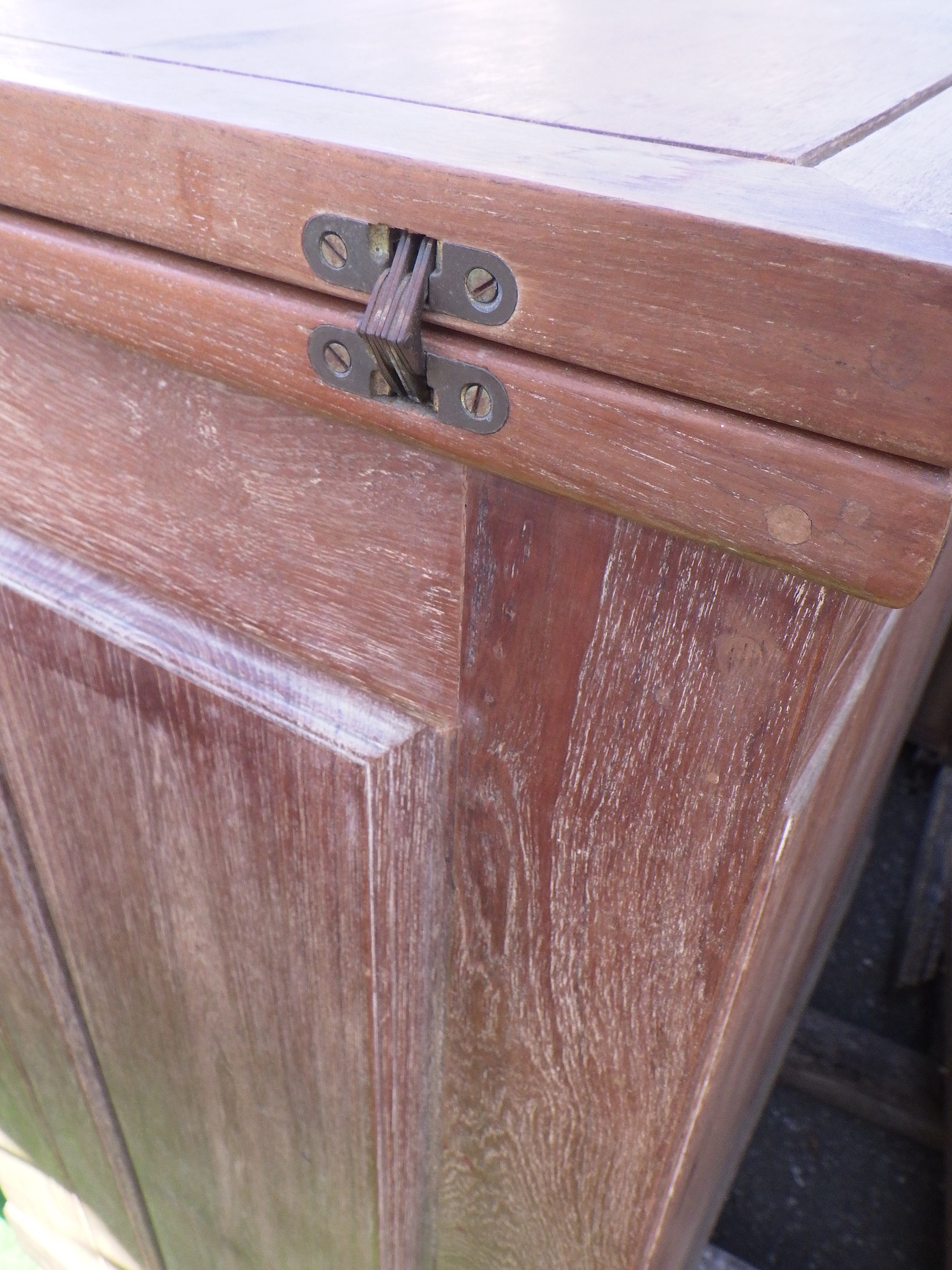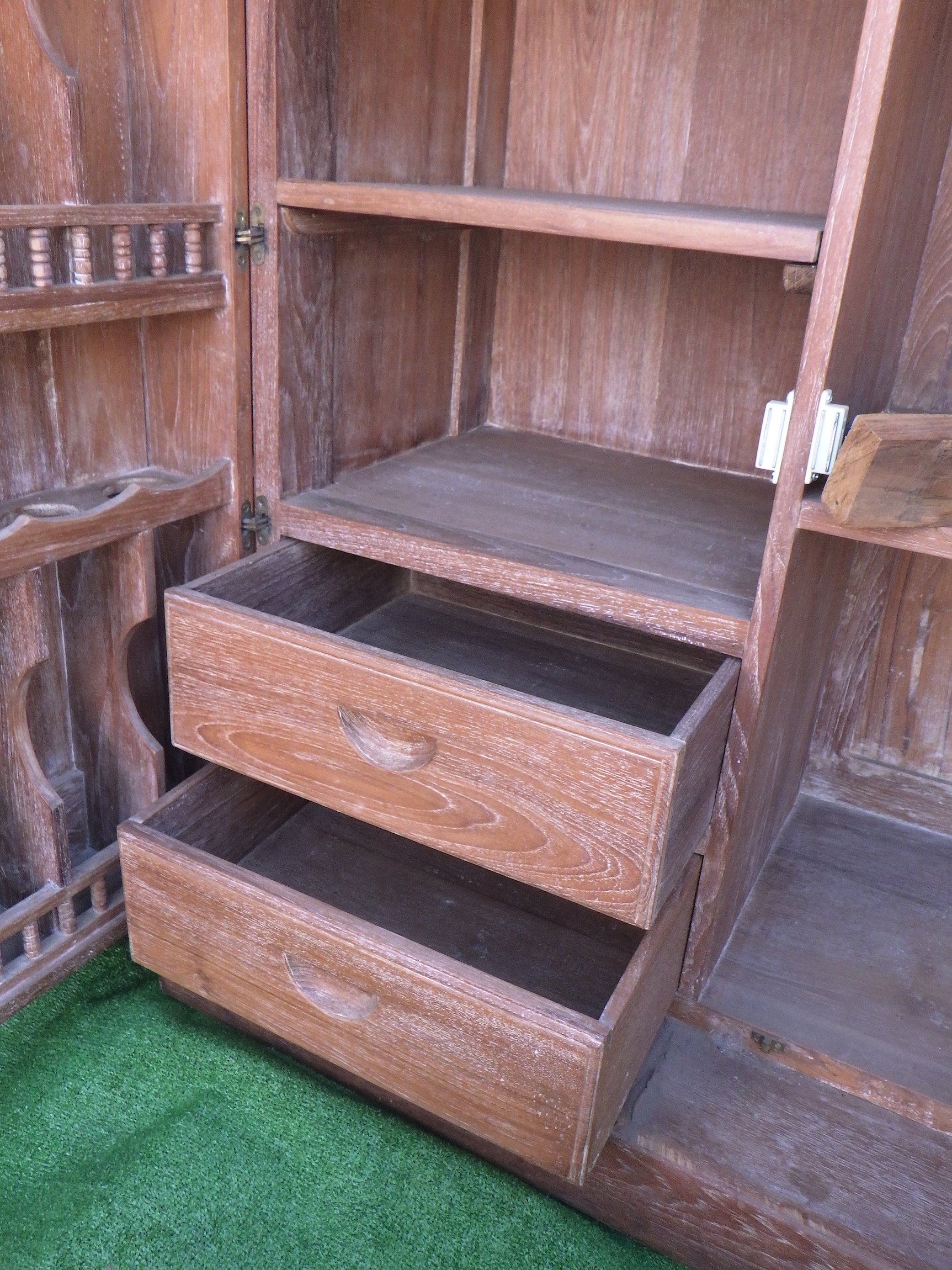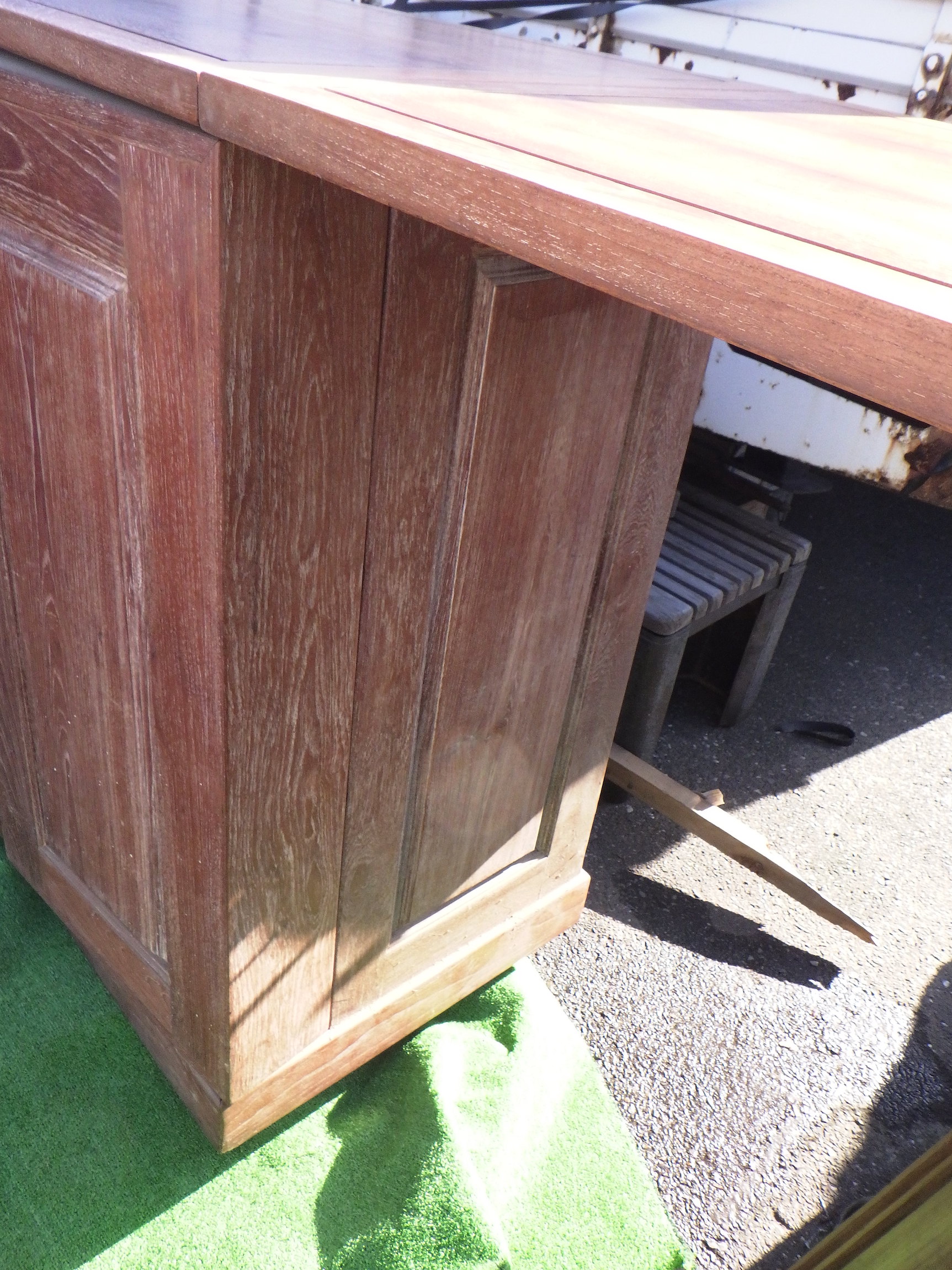 一見、戸棚のようですが、重厚な扉を開けると何本もワインをしまえる収納庫になっています。材質はおそらくチーク材と思われます。ただしまい込むのではなく、見せる収納のデザインになっているところがニクいです。天板は左右にひらきますのでちょっとしたテーブルのように使うこともできると思います。(開くと1825mm)素材にしても、デザインにしてもちょっと珍しいお品と言えそうです。