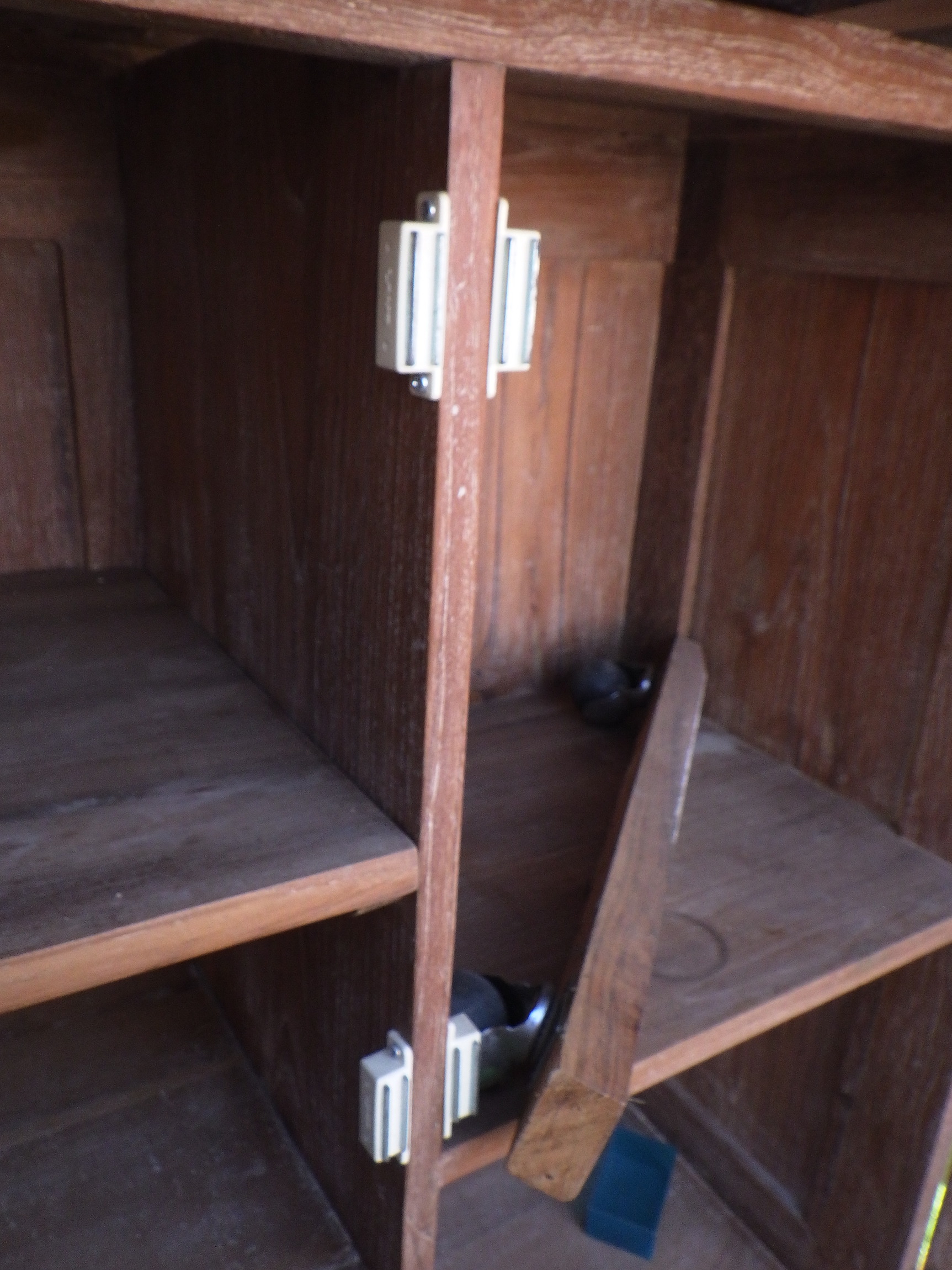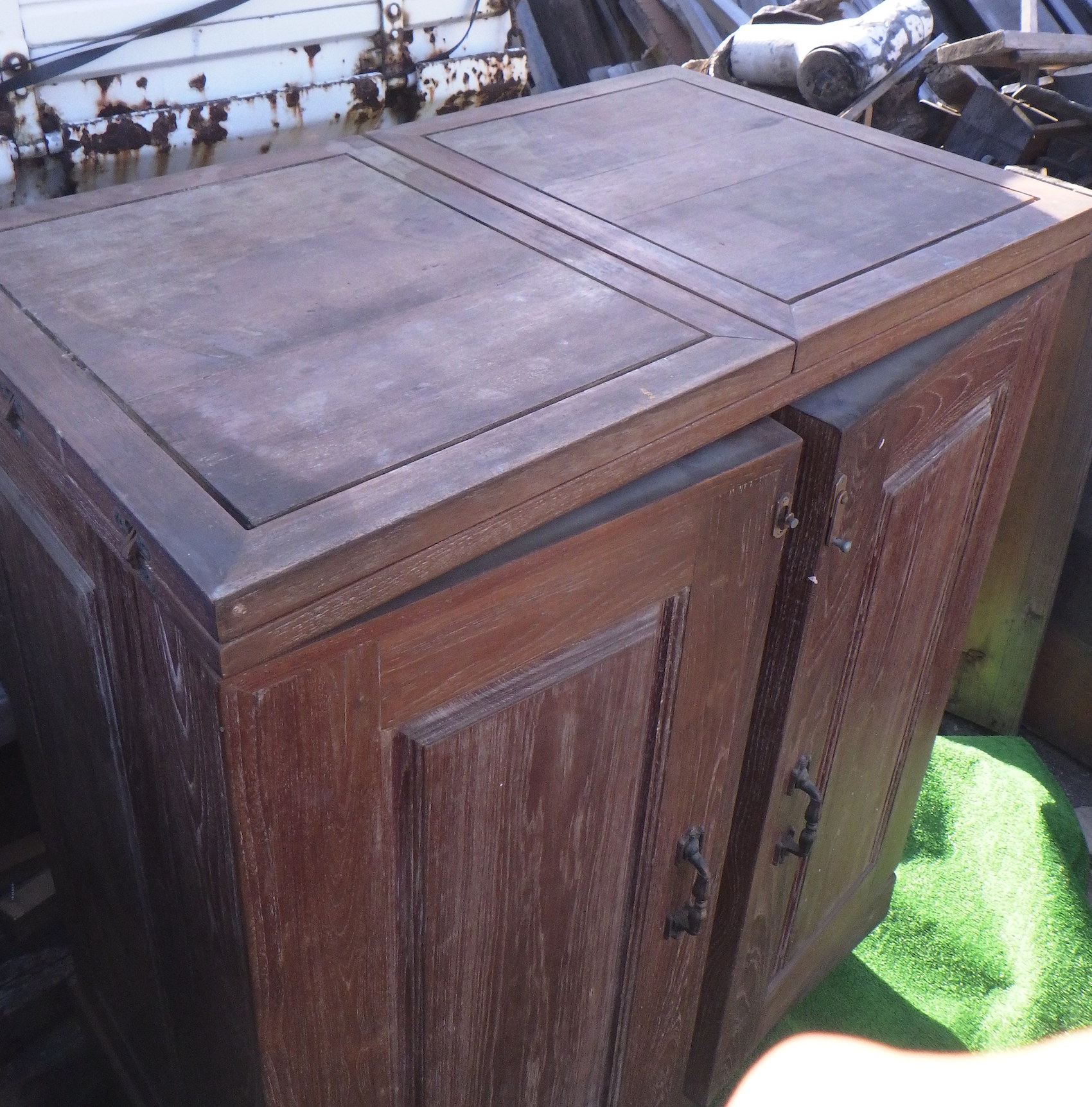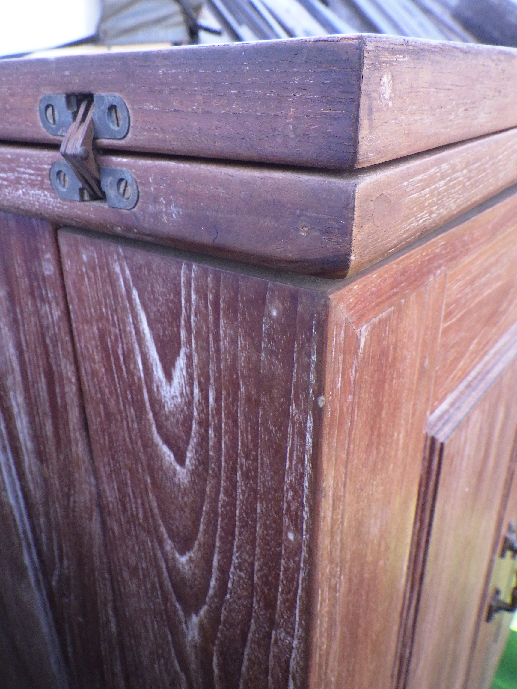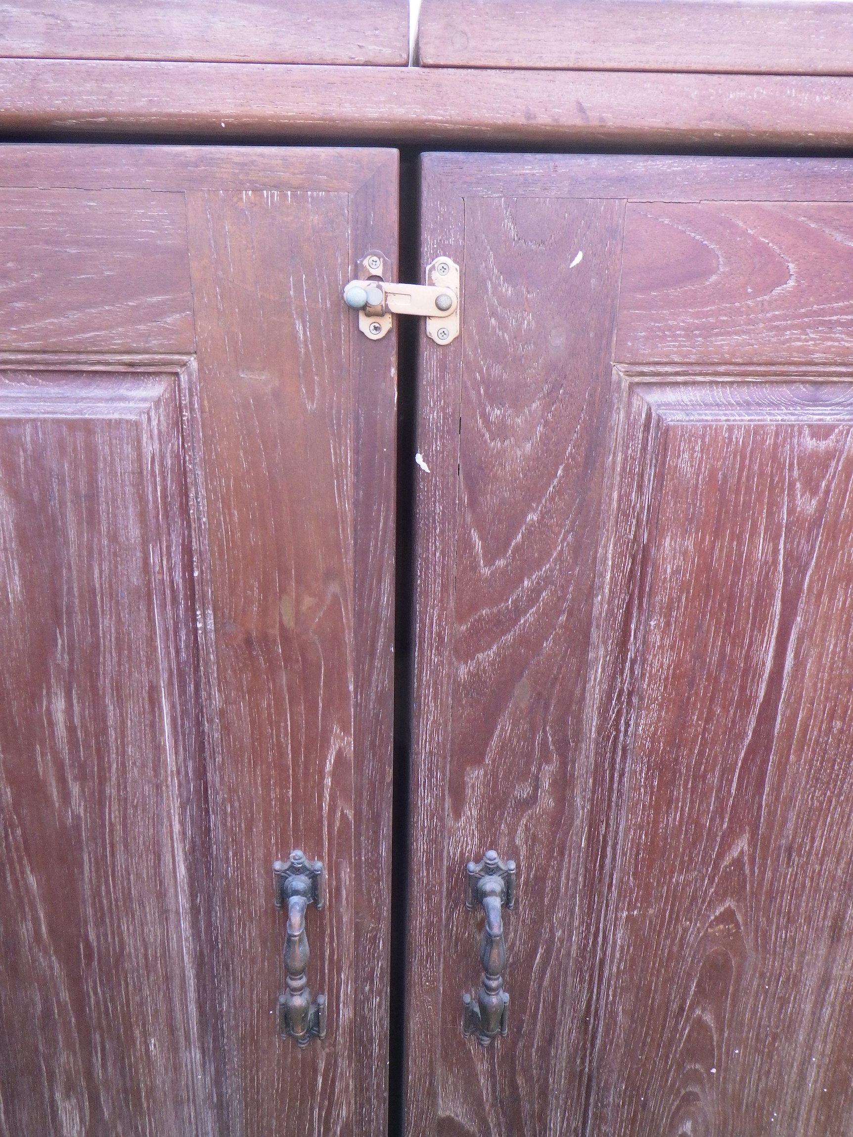 一見、戸棚のようですが、重厚な扉を開けると何本もワインをしまえる収納庫になっています。材質はおそらくチーク材と思われます。ただしまい込むのではなく、見せる収納のデザインになっているところがニクいです。天板は左右にひらきますのでちょっとしたテーブルのように使うこともできると思います。(開くと1825mm)素材にしても、デザインにしてもちょっと珍しいお品と言えそうです。