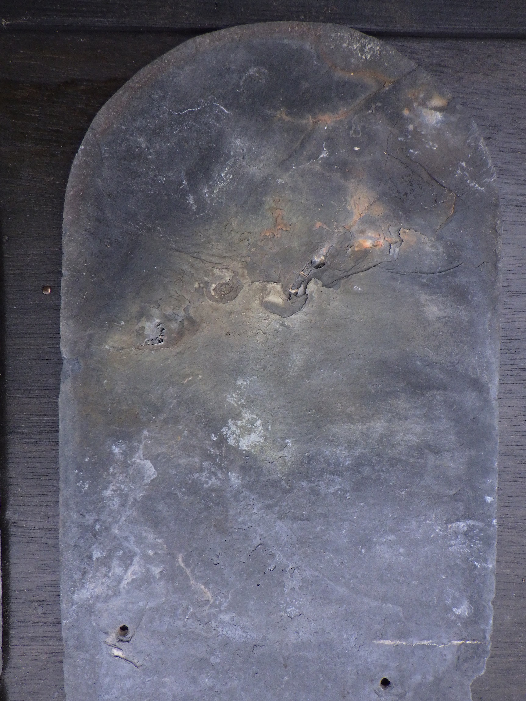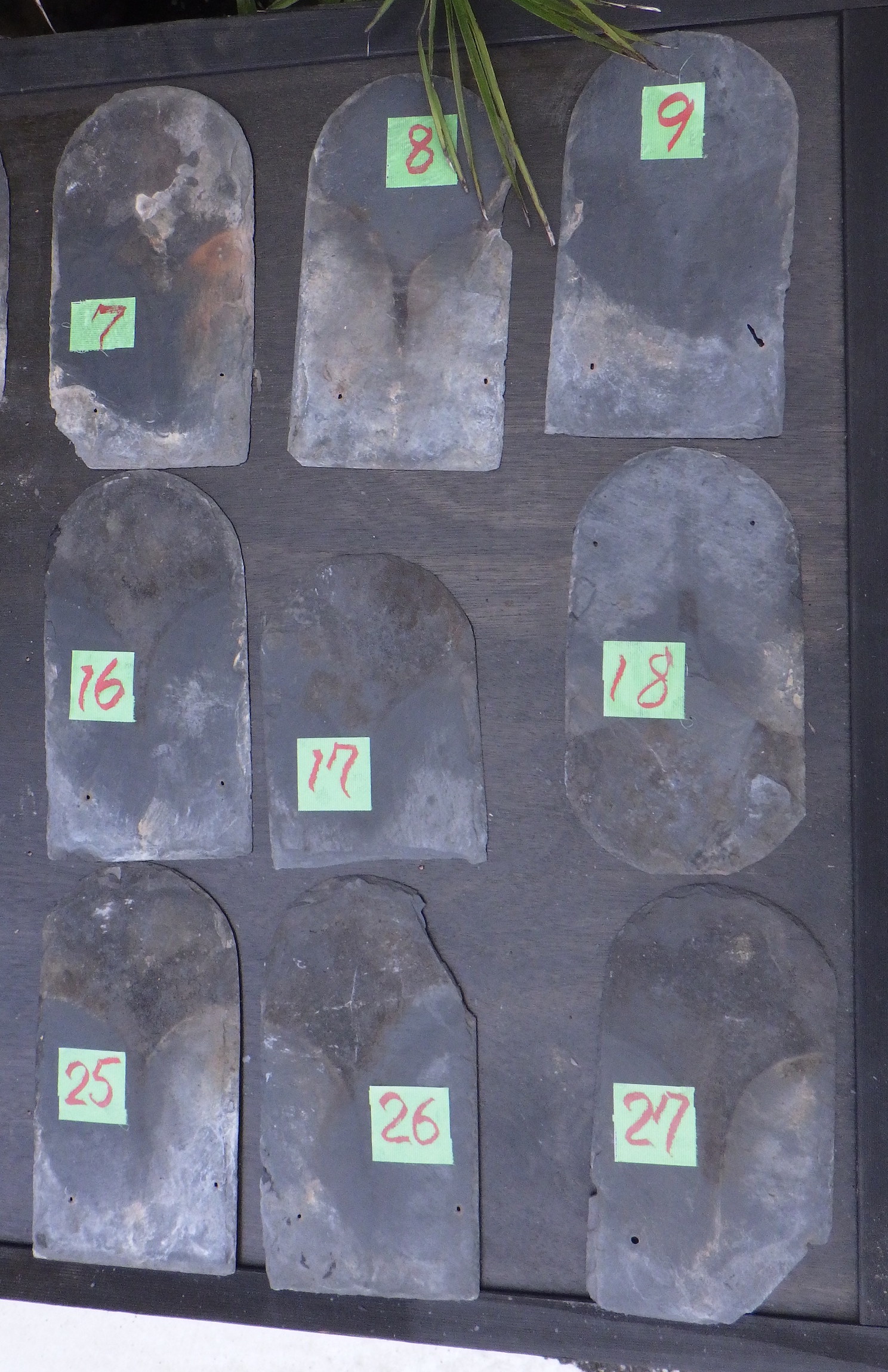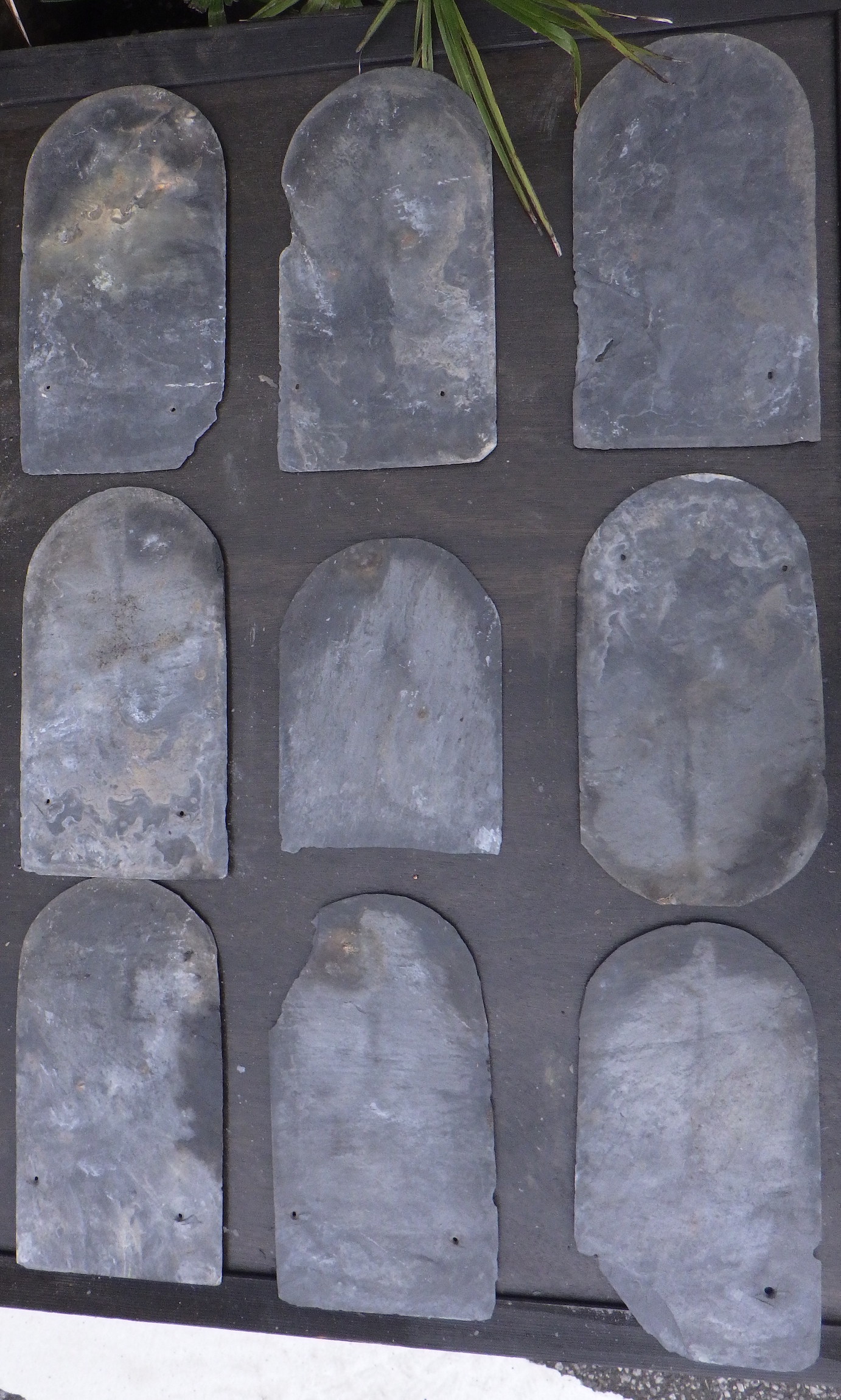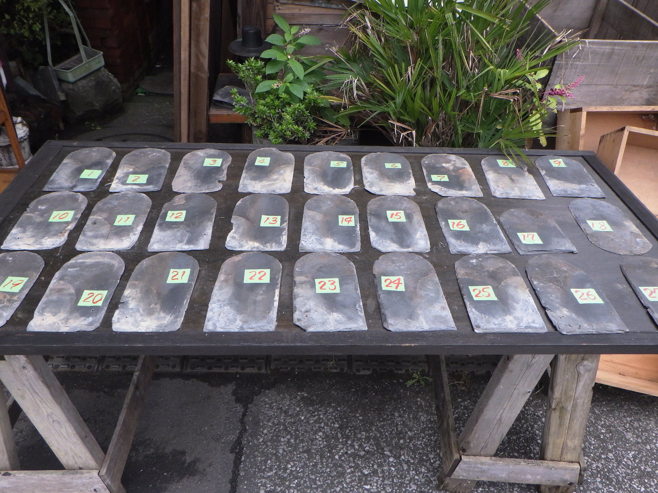 スレートの屋根です。重ねた形にあわせて屋根の跡が残っており、大変面白い素材です。在庫一杯ありますので、お問い合わせください。