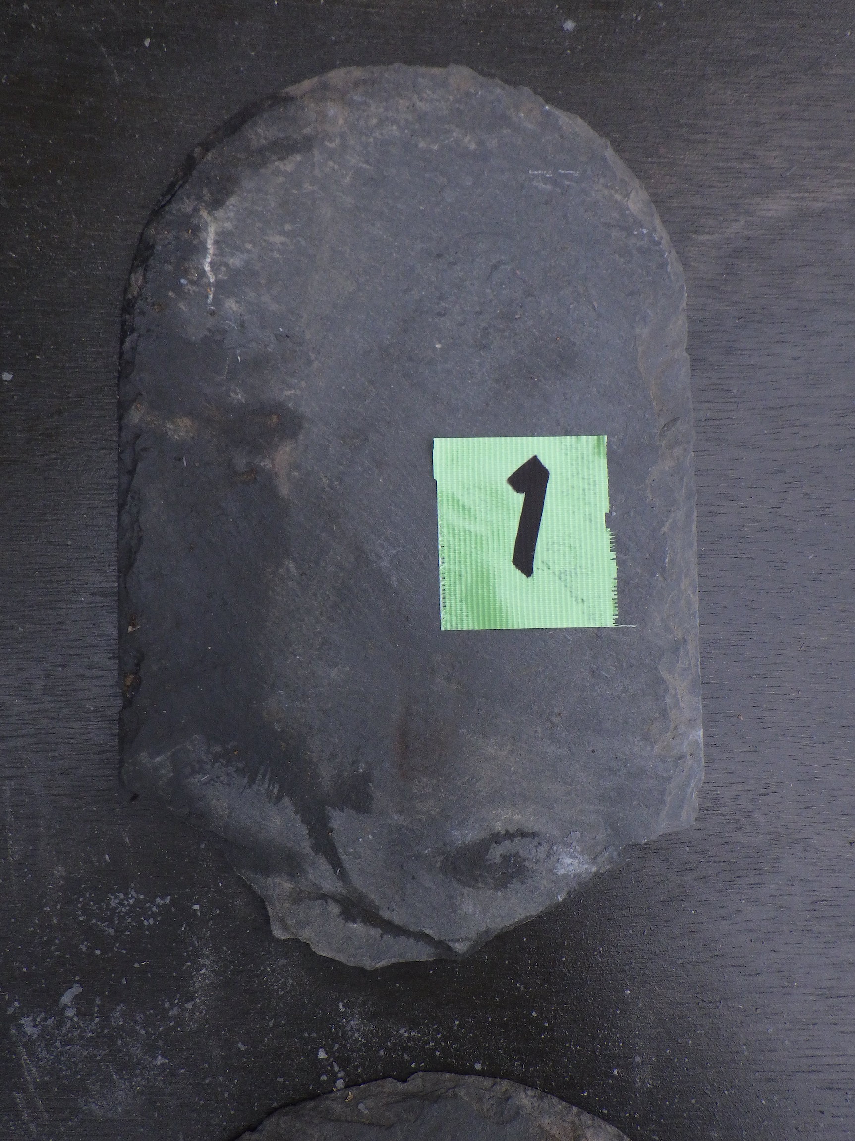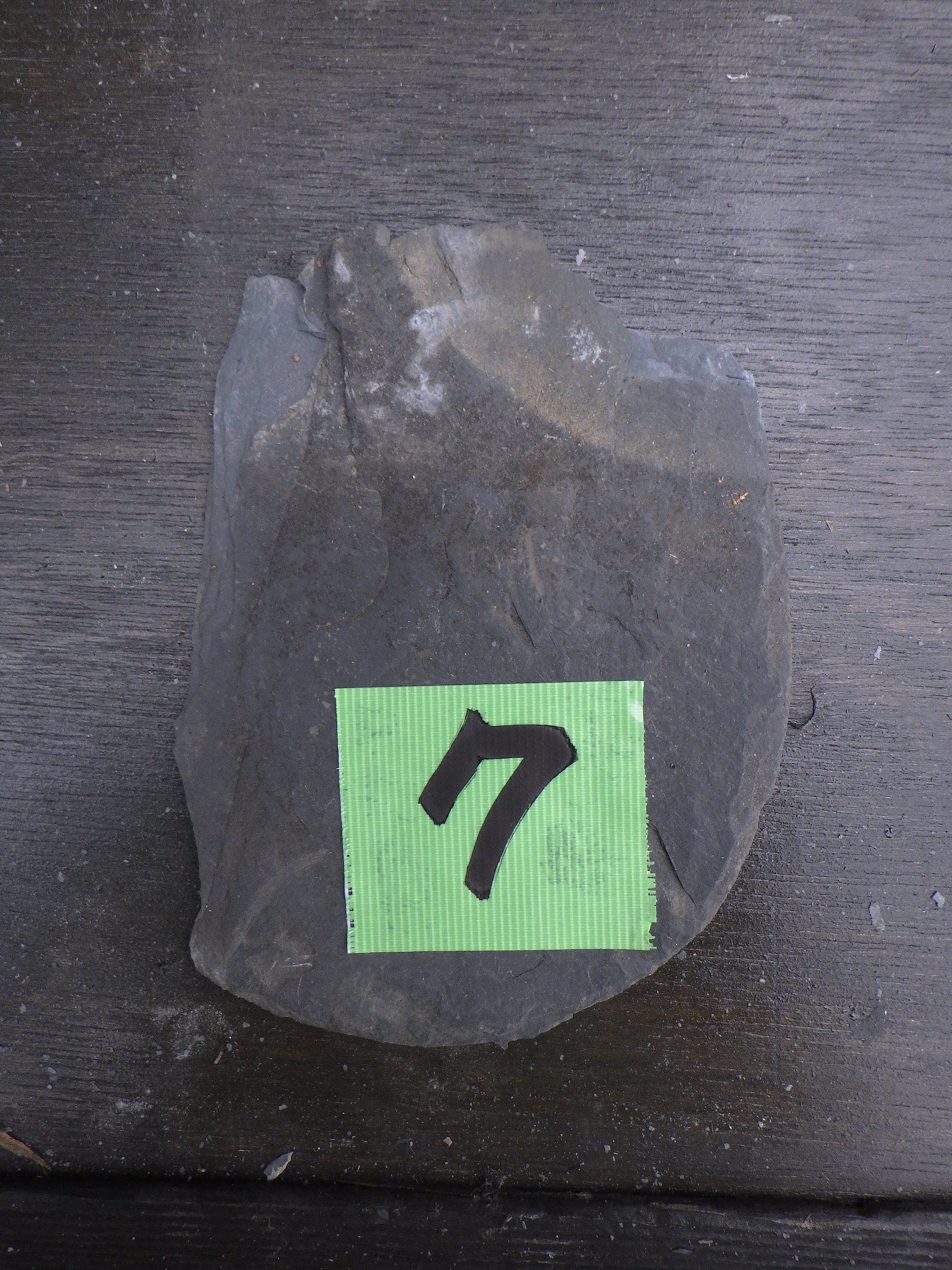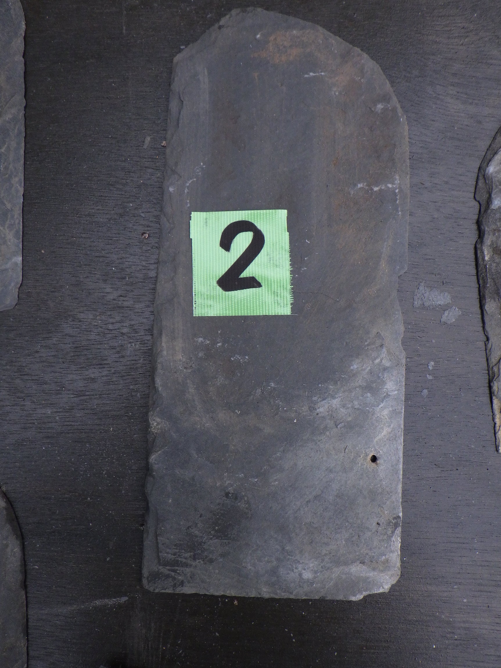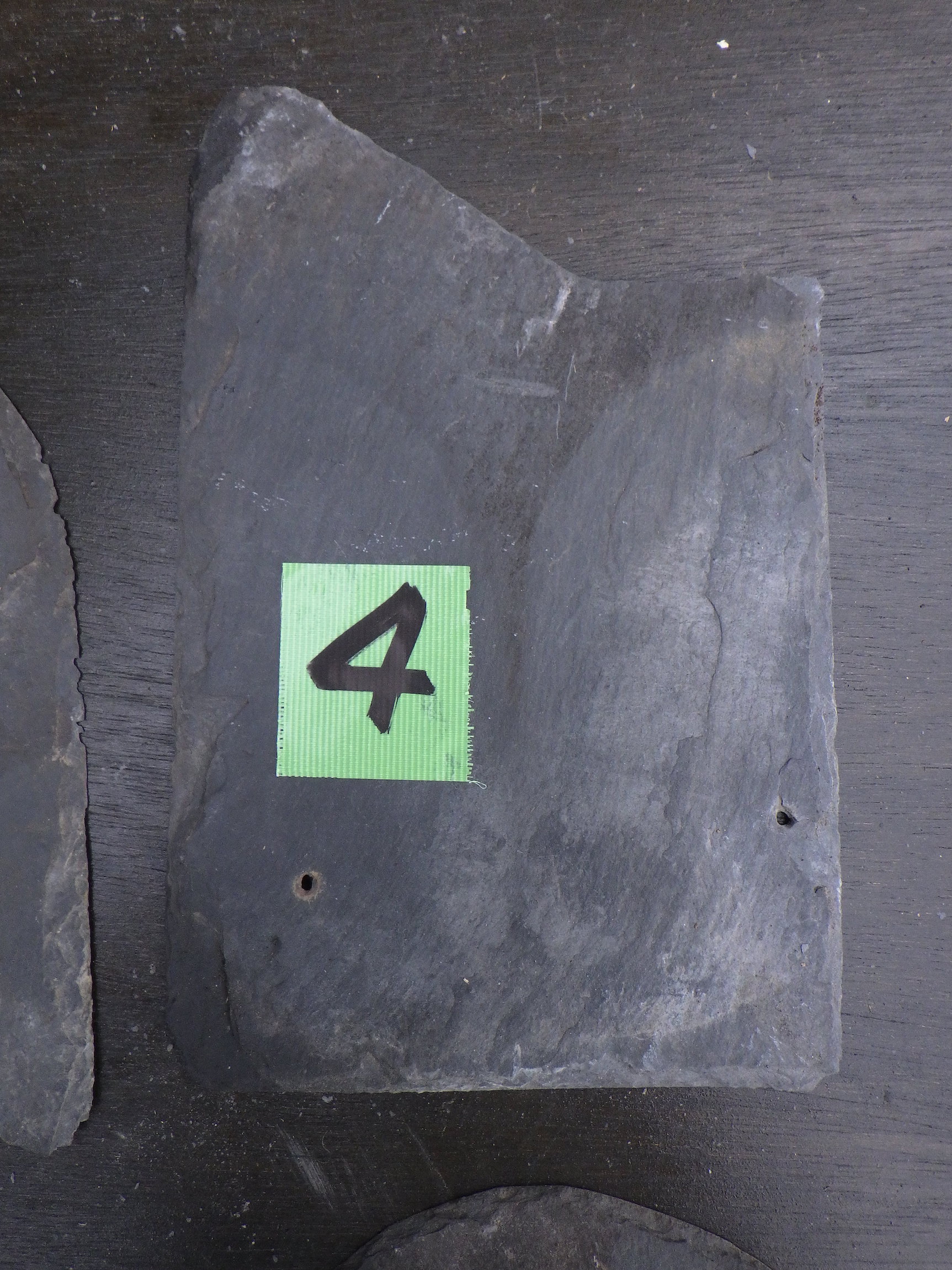 スレートの屋根のかけらです。重ねた形にあわせて屋根の跡が残っており、大変面白い素材です。欠ける前の元々の大きさがおよそ270×150×3です。かけらなので、個々それ以下の大きさになっています。