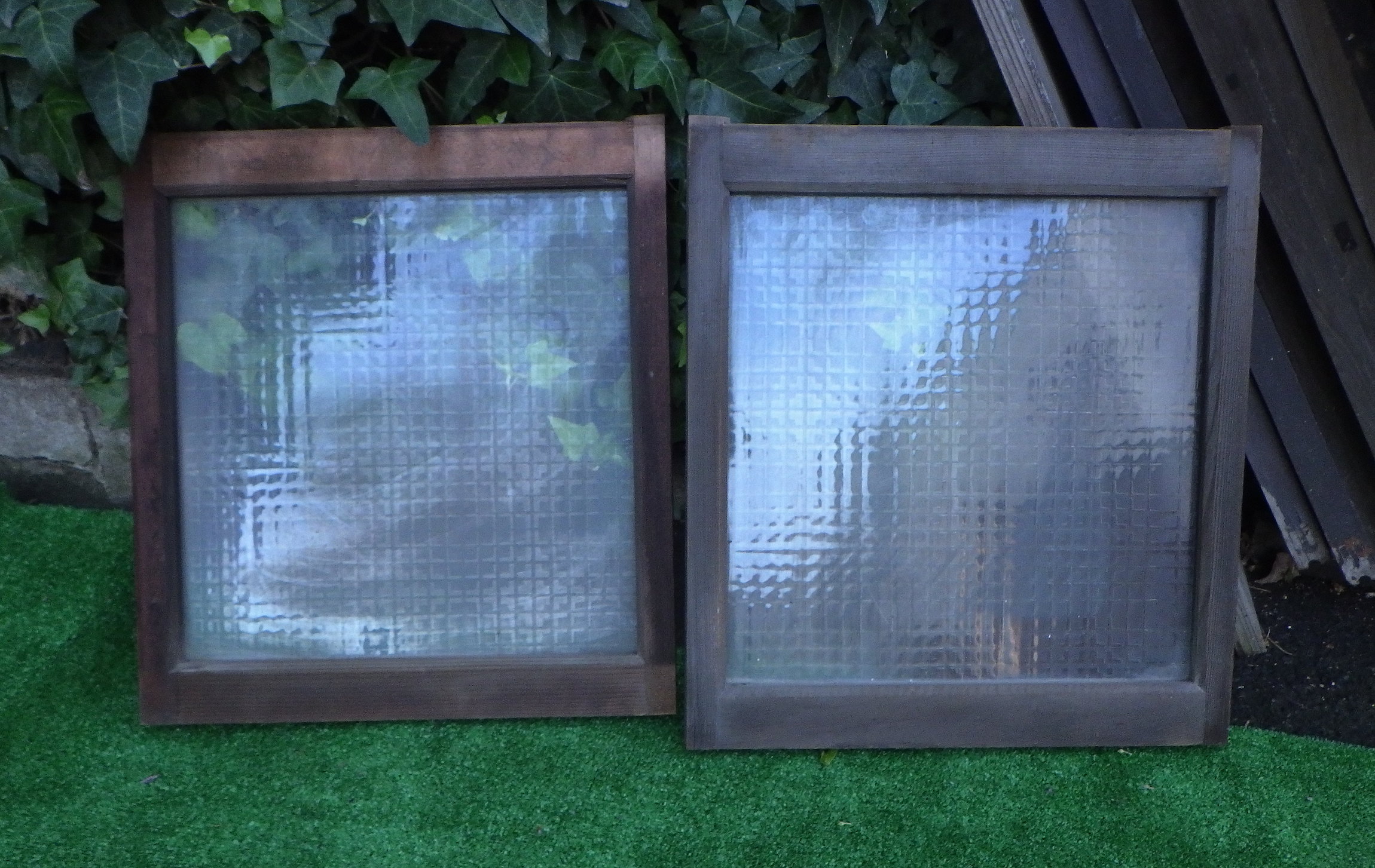 レトロな模様が美しいガラス窓です。2枚1組でご購入いただくと5,000(税抜)円です。