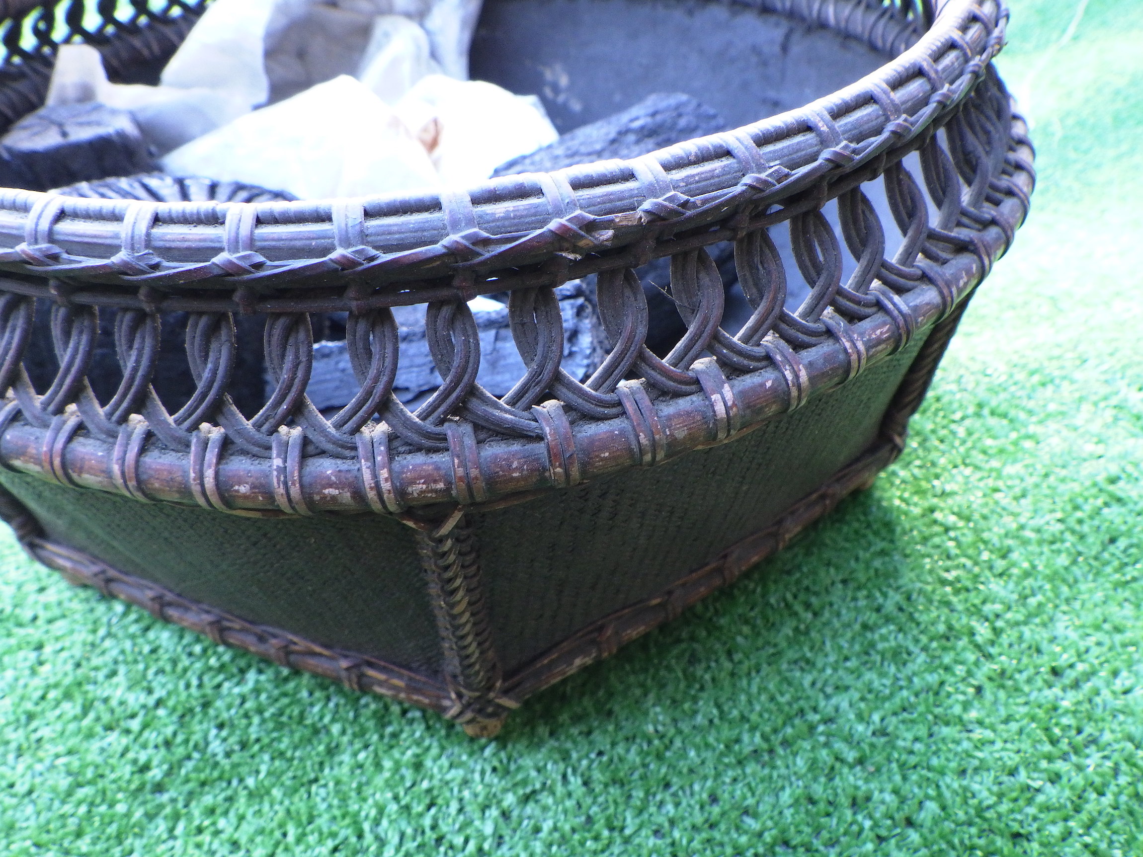手わざが光る炭入れです。細やかな作りに思わず目を奪われます。底面に穴が空いている箇所がございます。