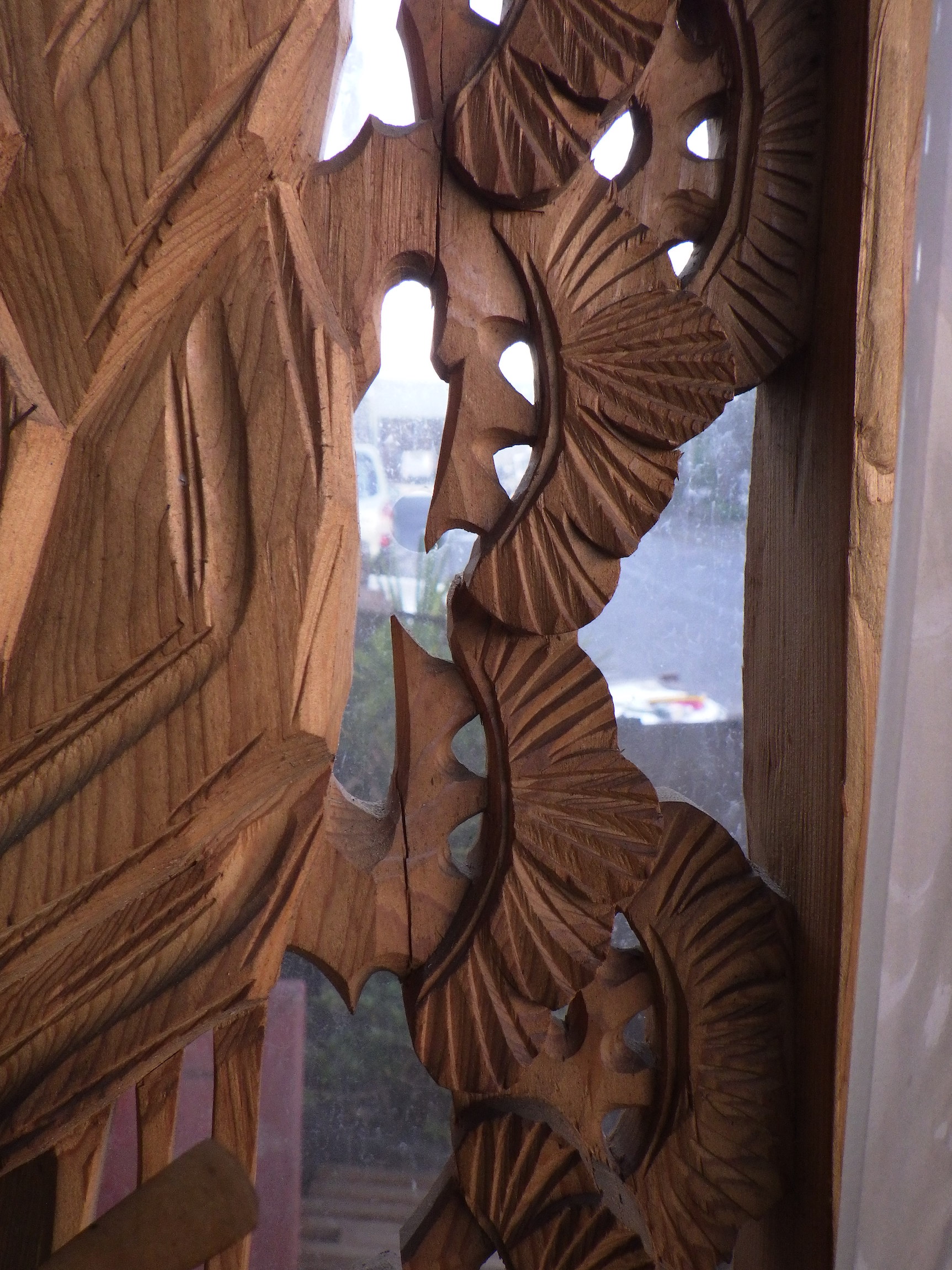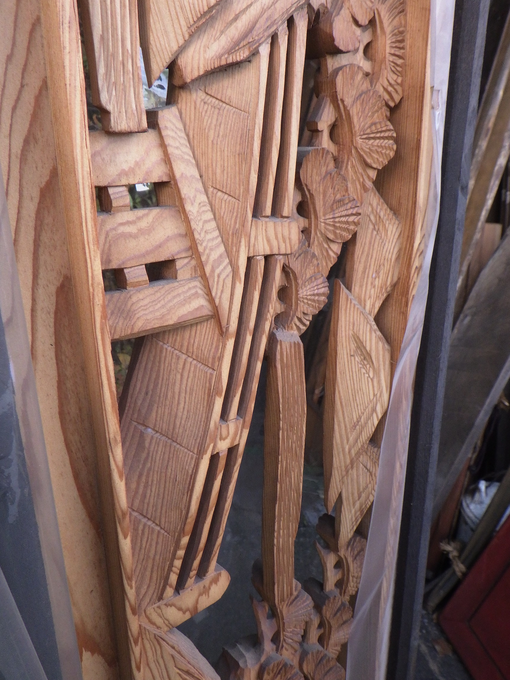 近江八景がモチーフだと思われます。迫力のある立体的な彫刻です。