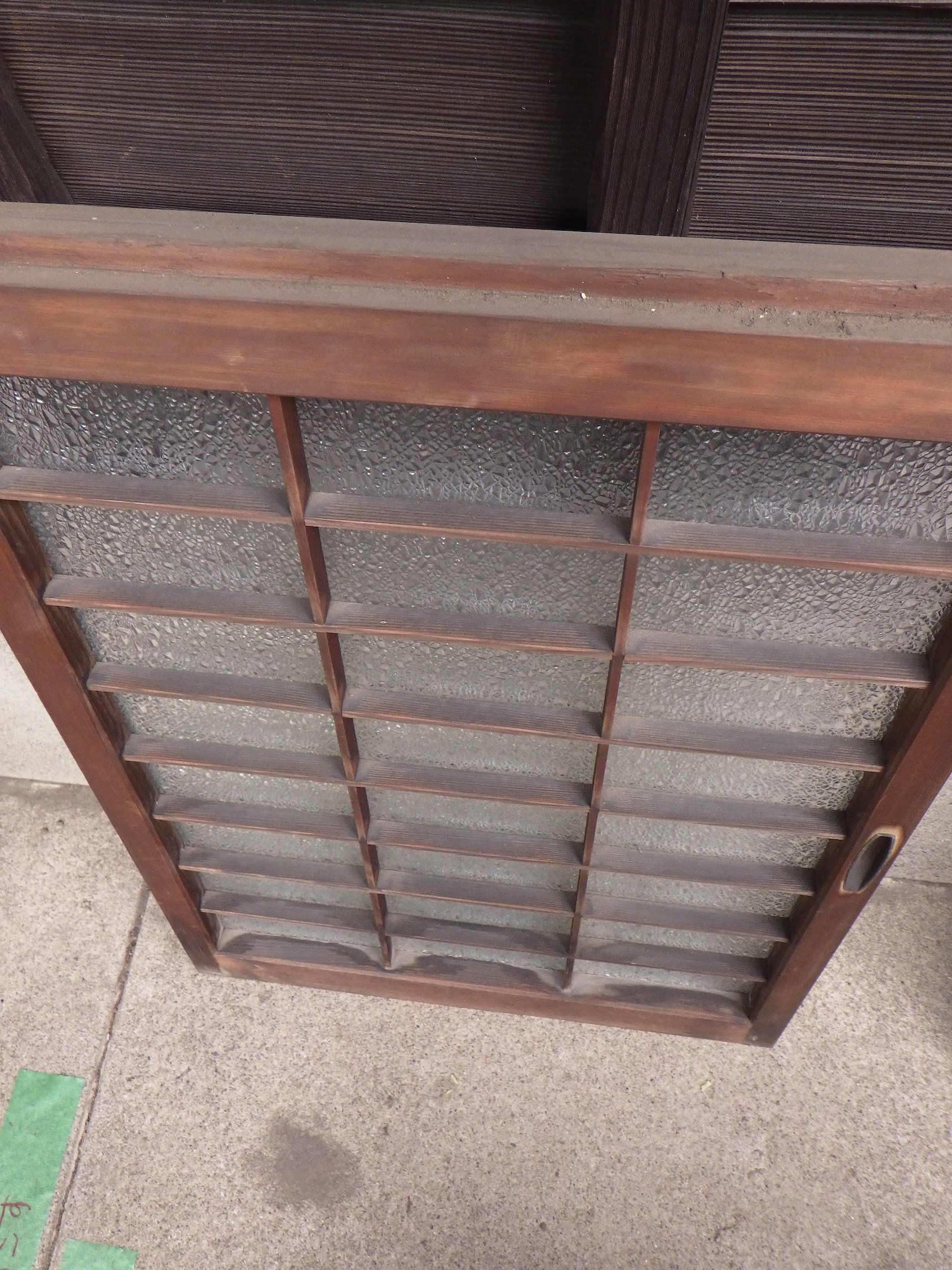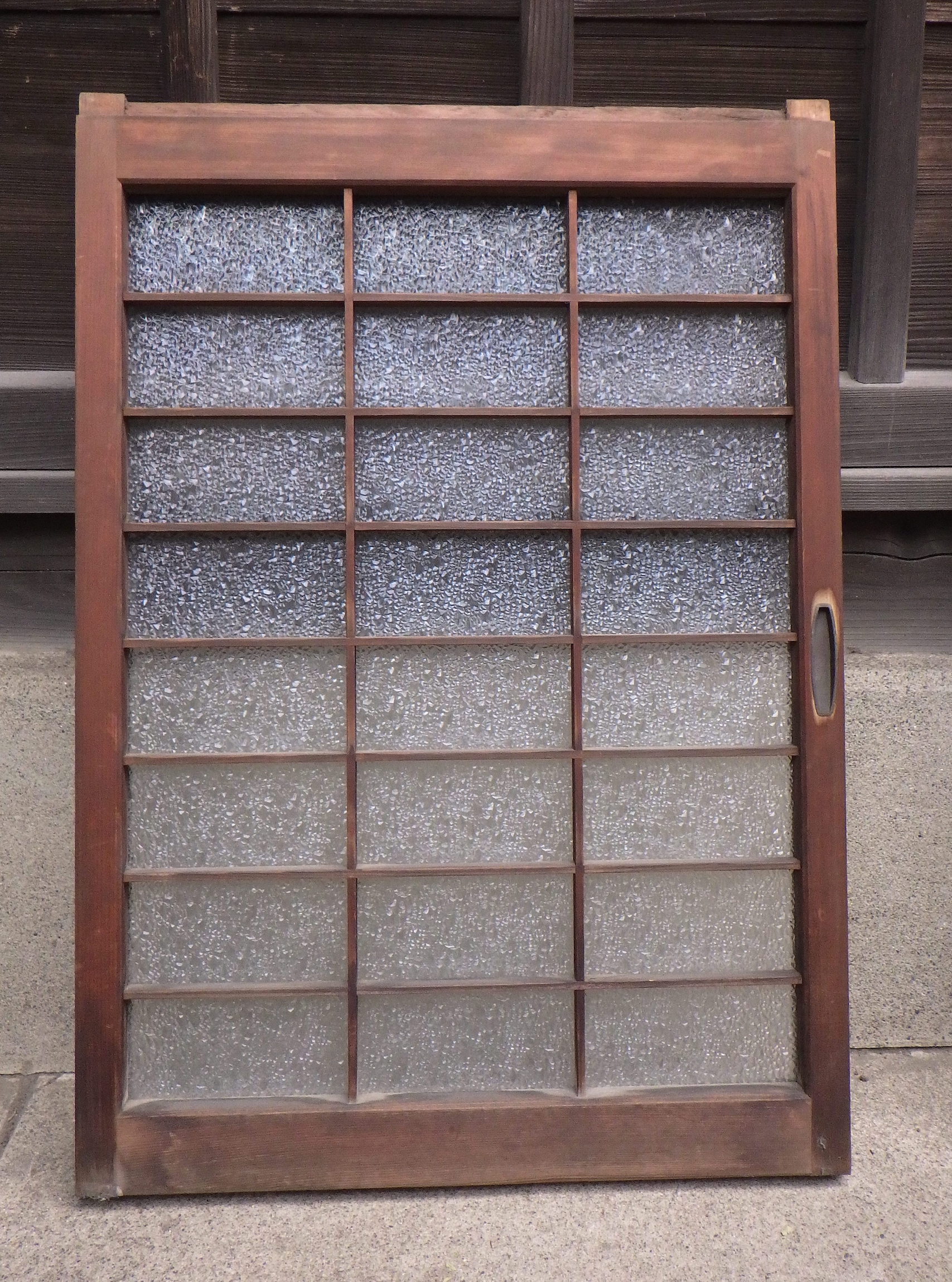 大田区の民家で使われていたものです。ダイヤガラスが使われています。高さ575mmと厚み28mmは全て同じですが、幅のサイズは大中小とございます。大492mm、中410mm、小345mmで在庫がそれぞれ2点ずつございます。