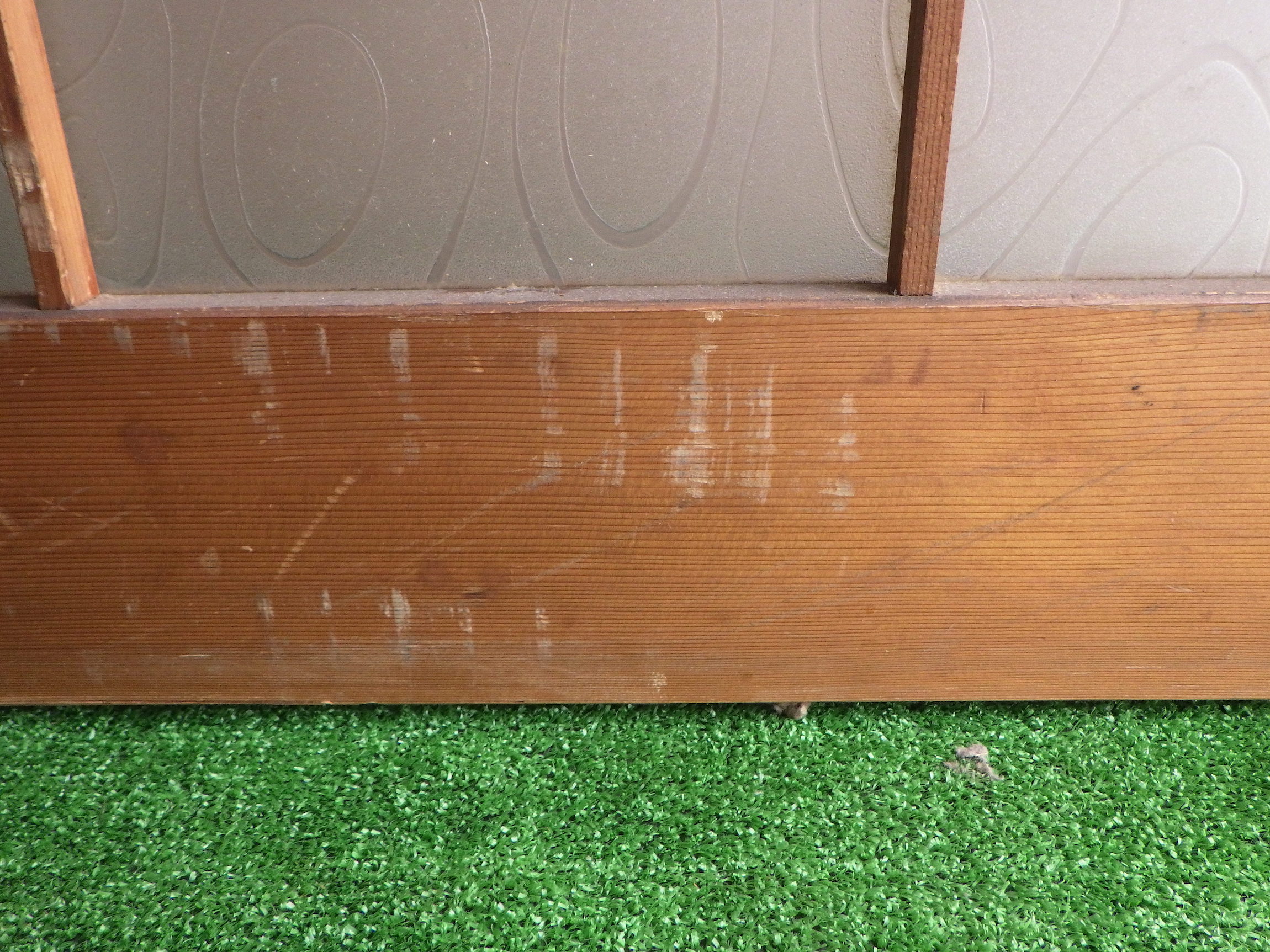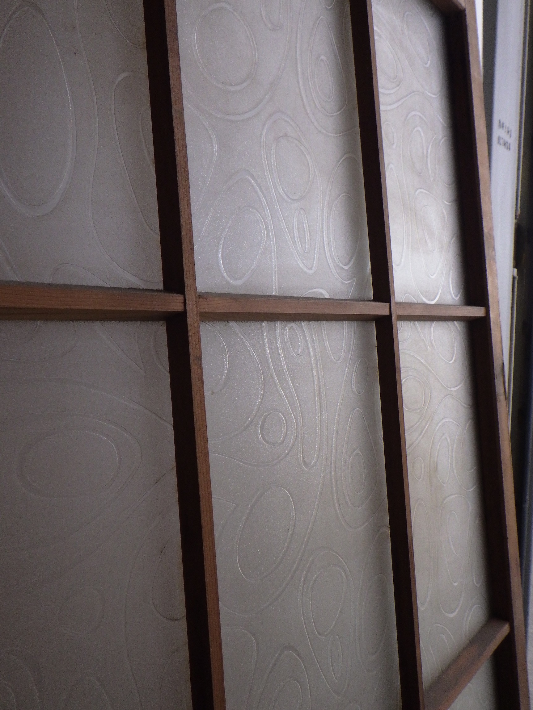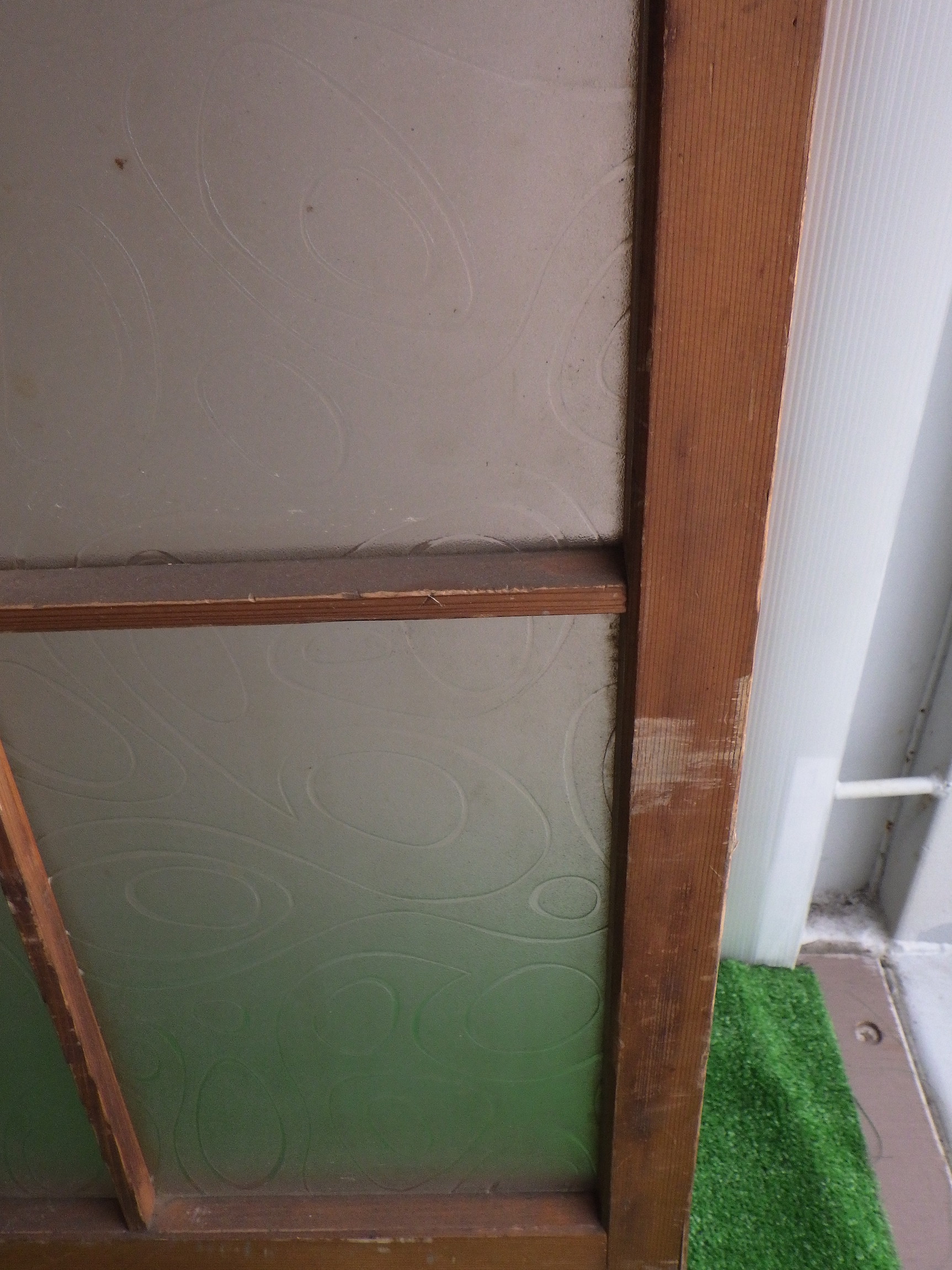 わけあり品。枠等にキズがあるため。川崎の民家で使われていたものです。障子戸のような軽やかさのある格子デザイン。ガラスには曲線がゆるやかに流れているような模様がついています。