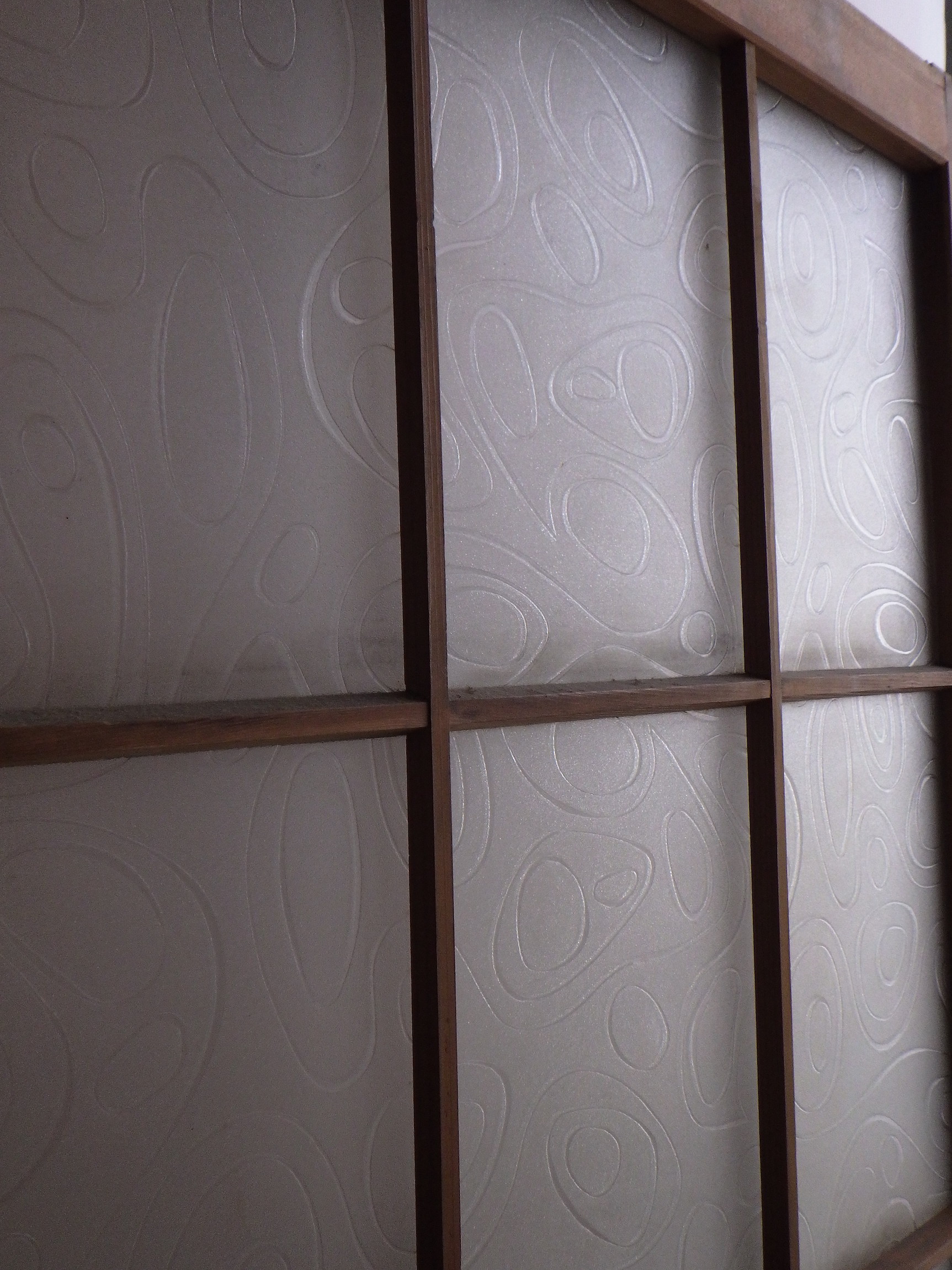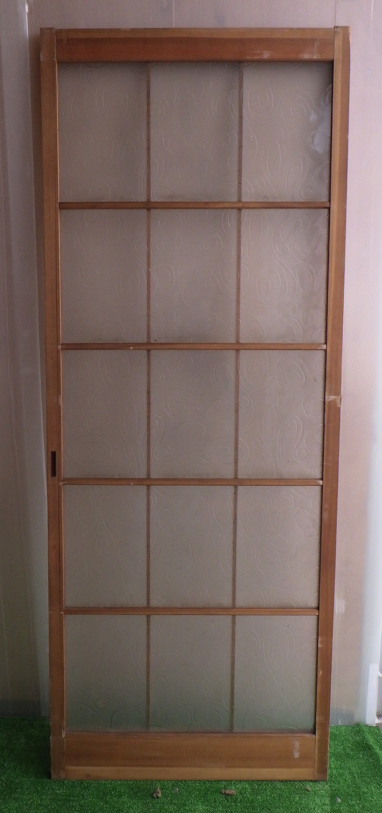 川崎の民家で使われていたものです。障子戸のような軽やかさのある格子デザイン。ガラスには曲線がゆるやかに流れているような模様がついています。