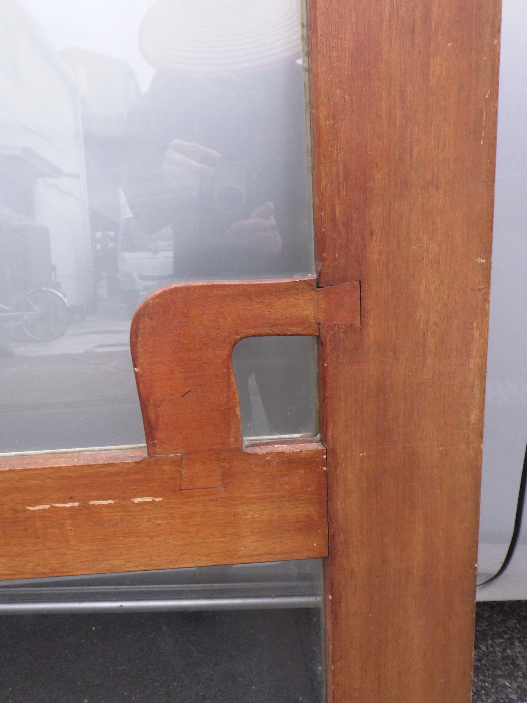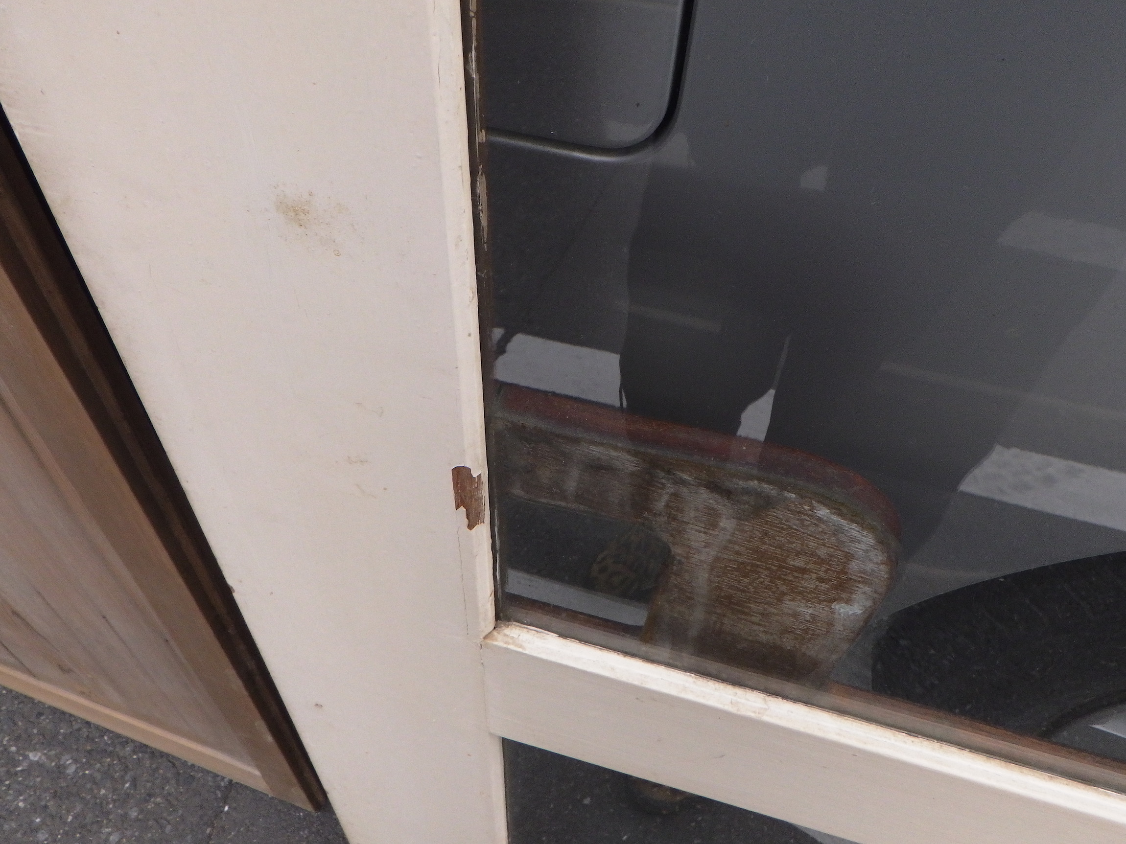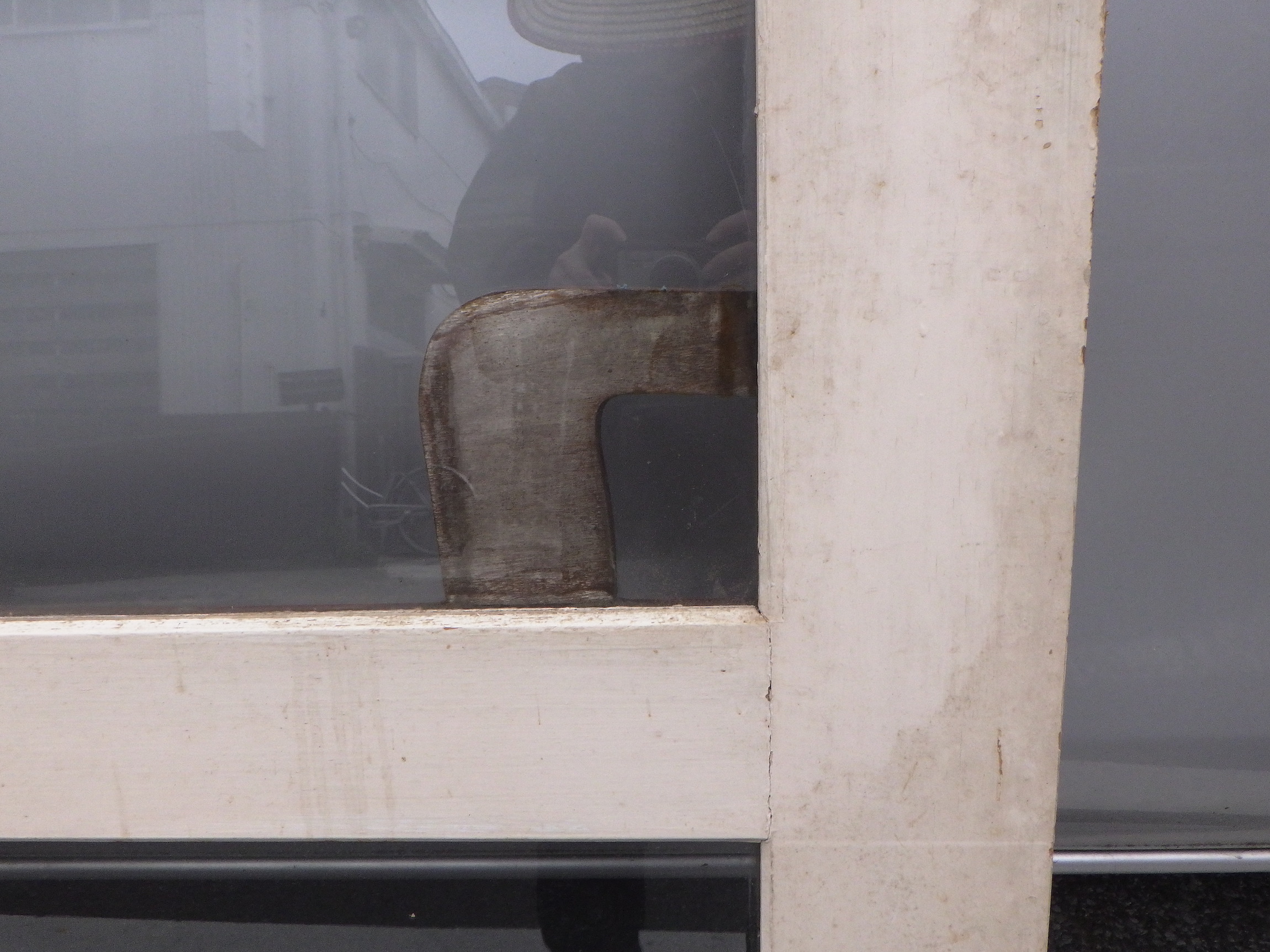 幅が1M以上あり、比較的大きめのガラス戸になります。デザイナーによる意匠で、取っ手のような曲線が中央にあります。白い面は屋外側に使われており、ペンキが塗られています。