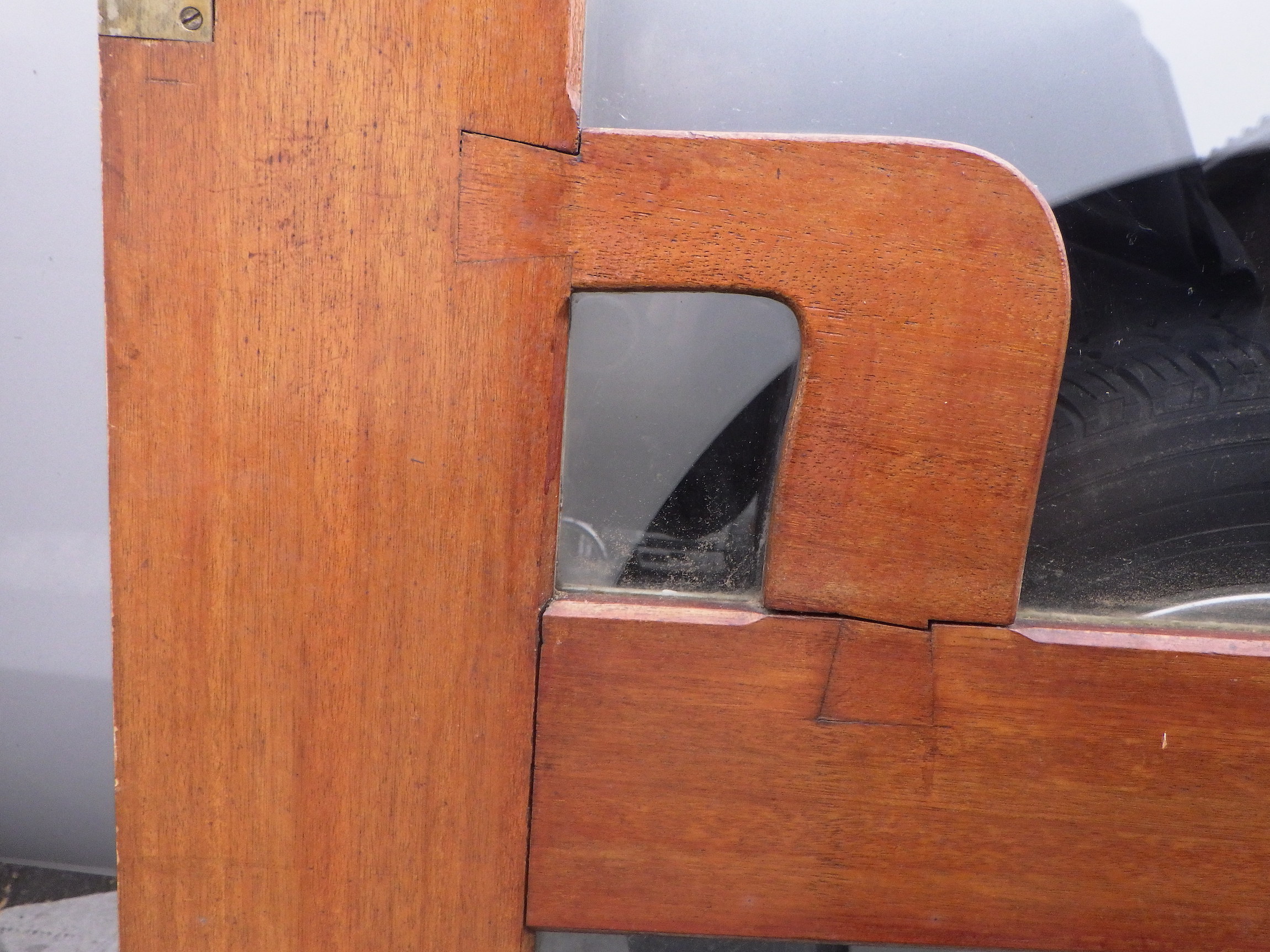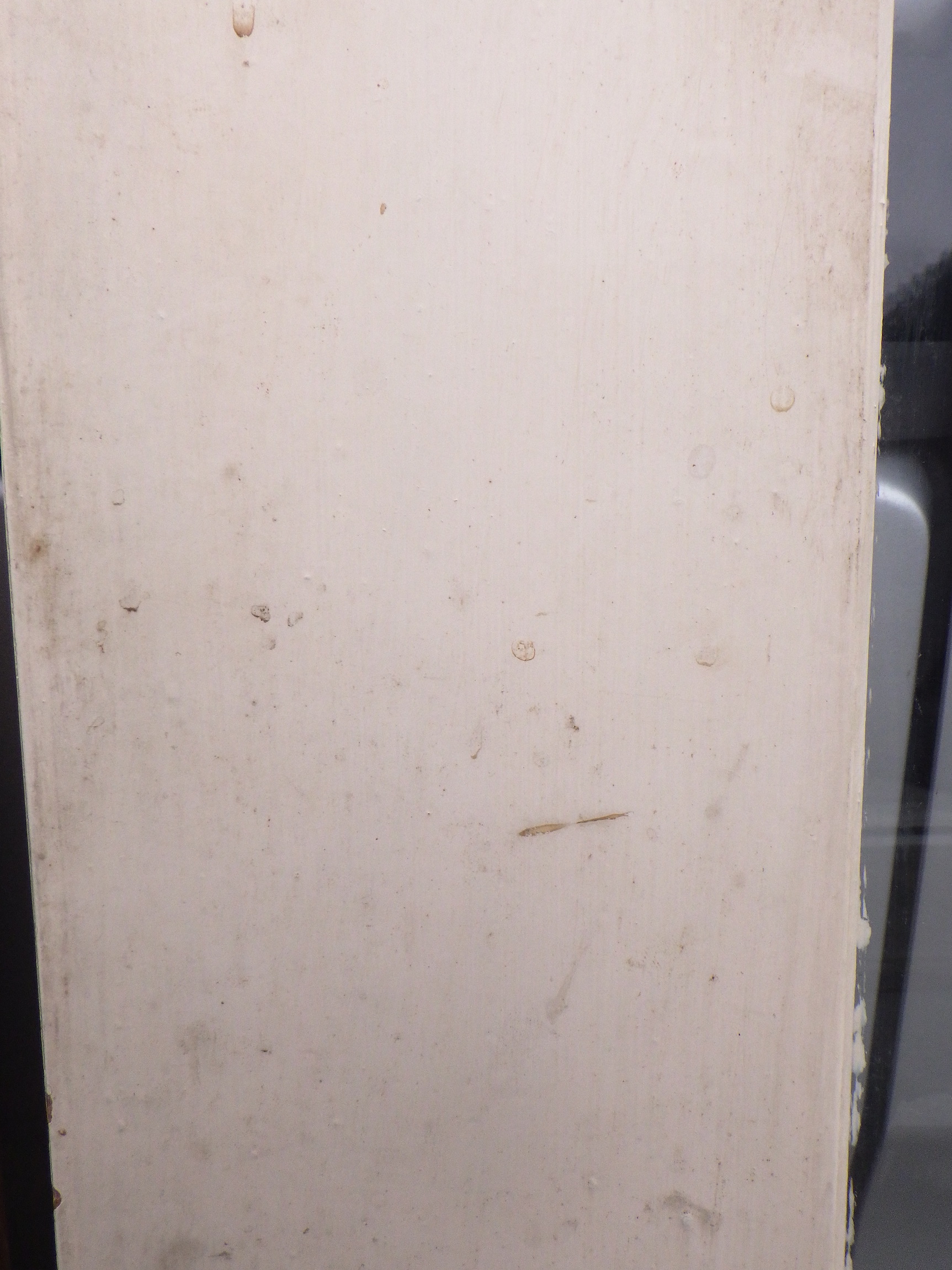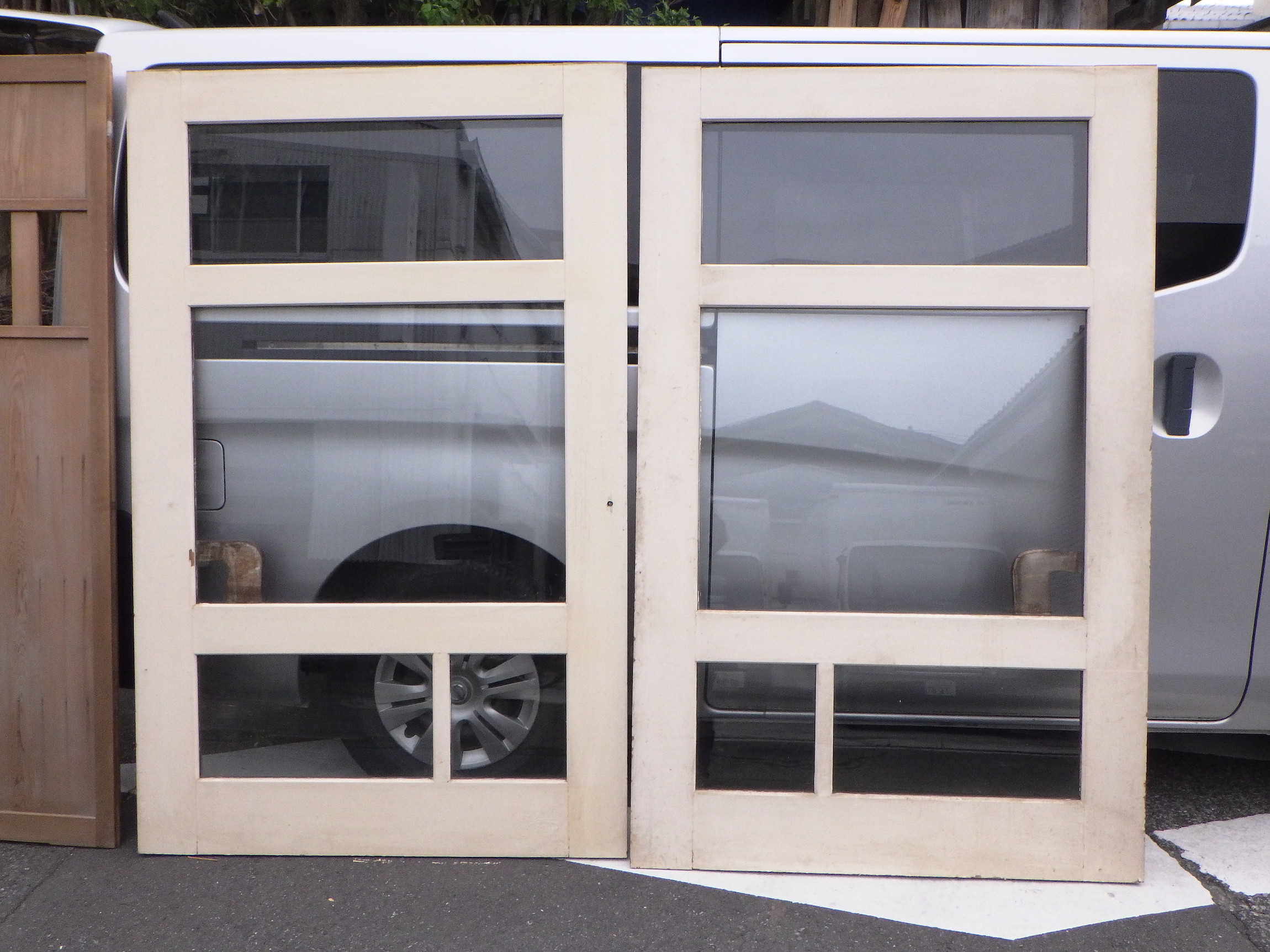 幅が1M以上あり、比較的大きめのガラス戸になります。デザイナーによる意匠で、取っ手のような曲線が中央にあります。白い面は屋外側に使われており、ペンキが塗られています。