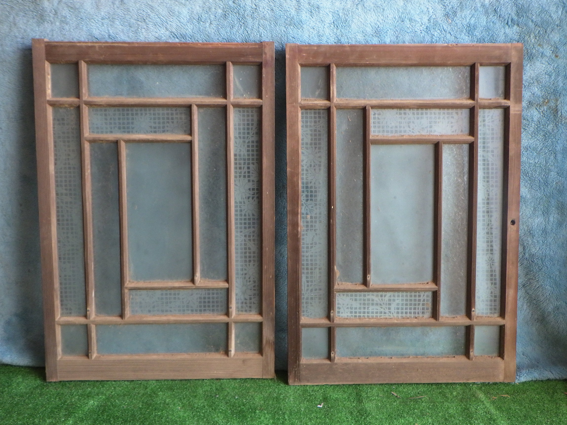 花柄とチェックが重なったレトロな模様のガラス、曇りガラス、草ガラスがそれぞれ4枚ずつ使われています。懐かしさ漂う窓です。