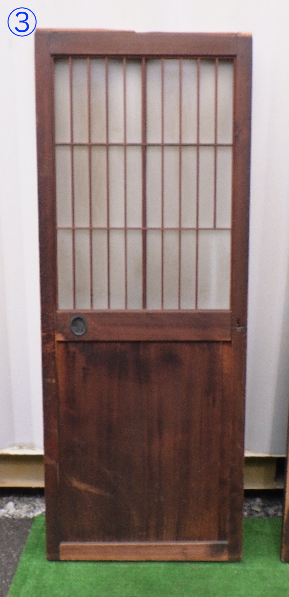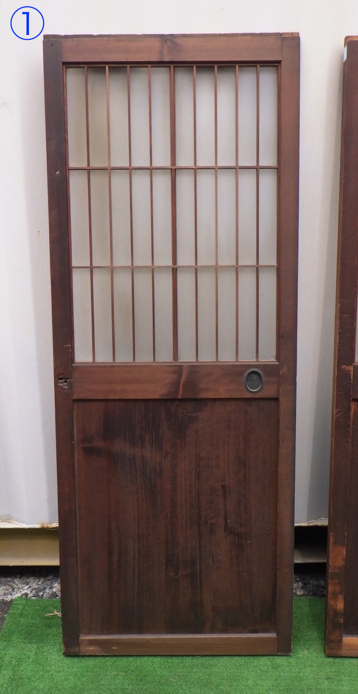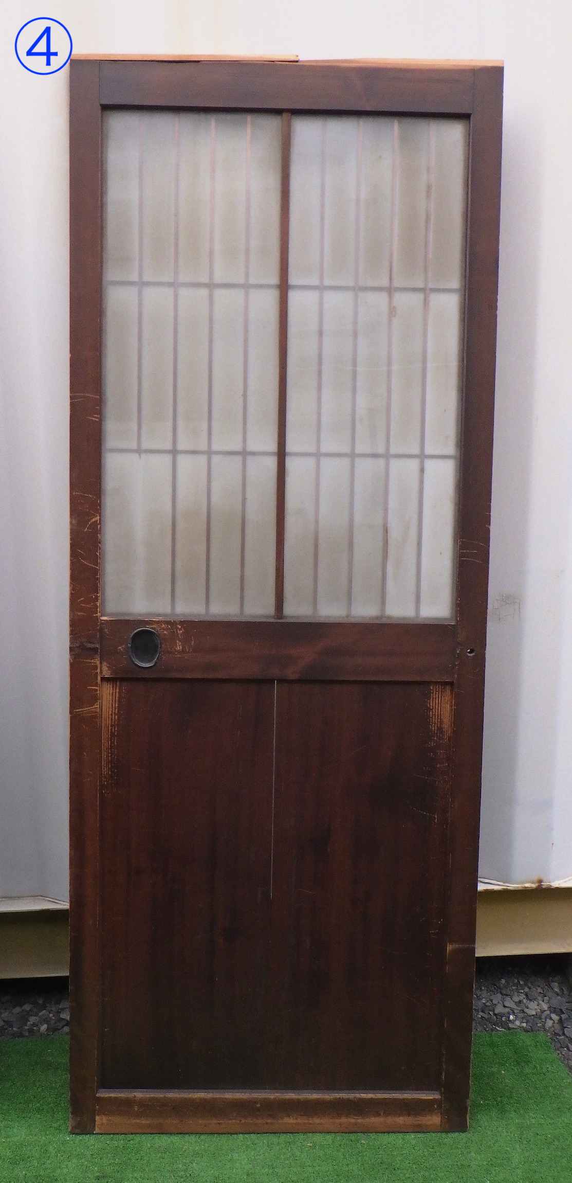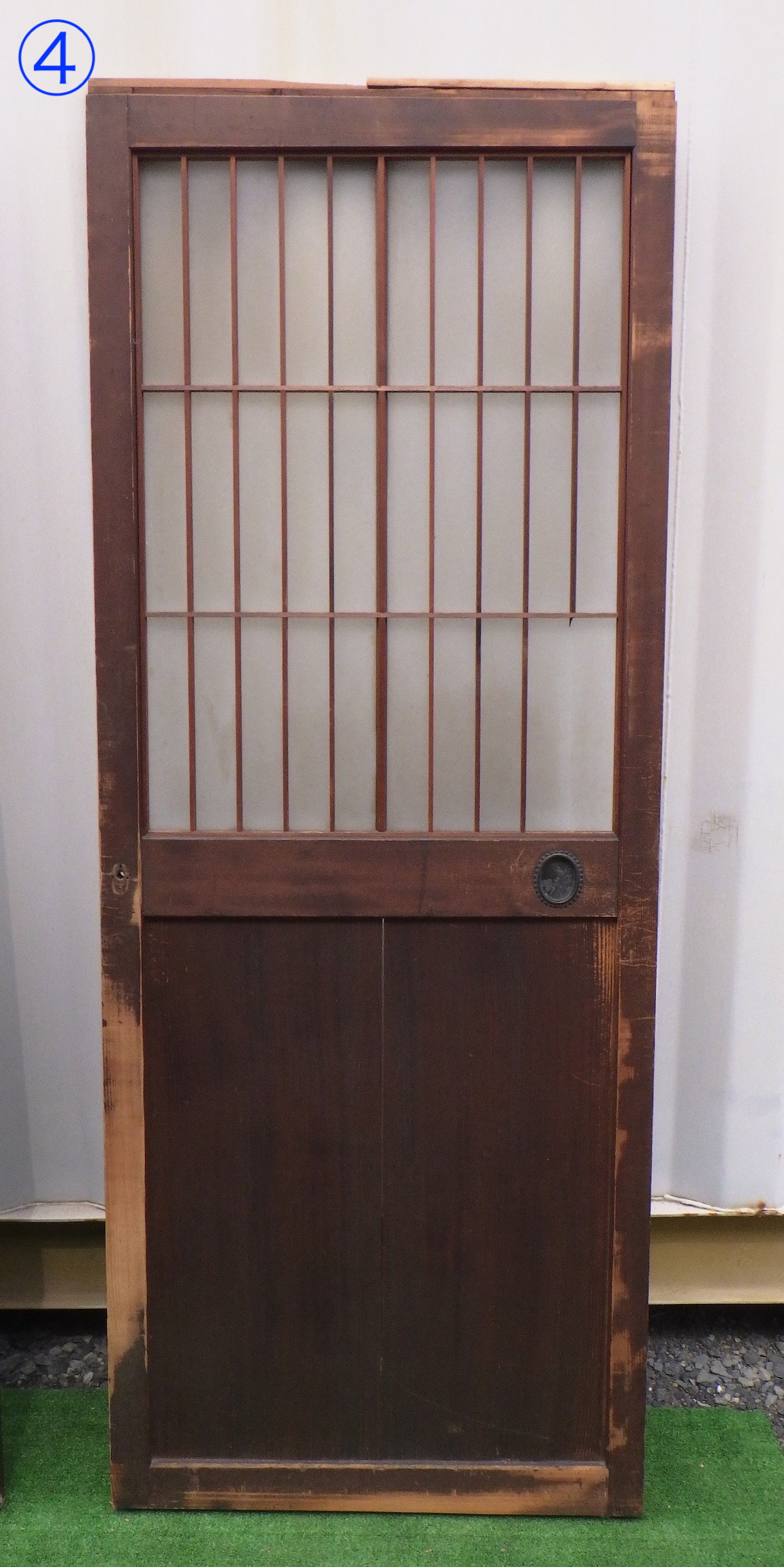わけあり品。3枚全て鍵はついていません。東京江東区の民家で使われていた戸です。以下個々の詳細となります。 ②は他の3枚と引き手のデザインが異なります。また、片面の引き手は割れている箇所があります。 ③と④は、格子の一部に折れている箇所があります。また腰板に隙間が見られるため、接着が必要です。 もともとどんな建物で使われていたかブログに載せてみましたのでこちらをご覧ください。 ①は完売致しました。