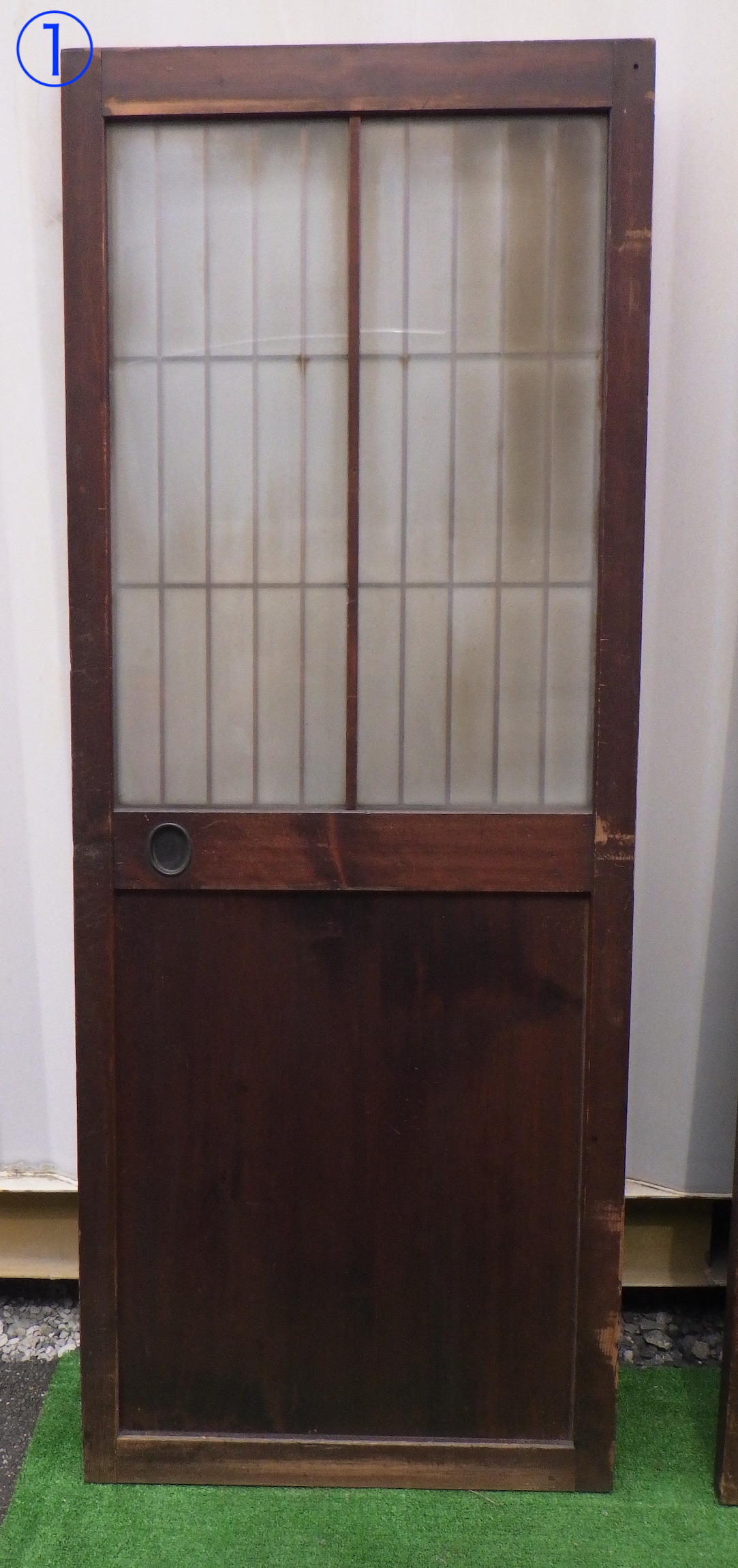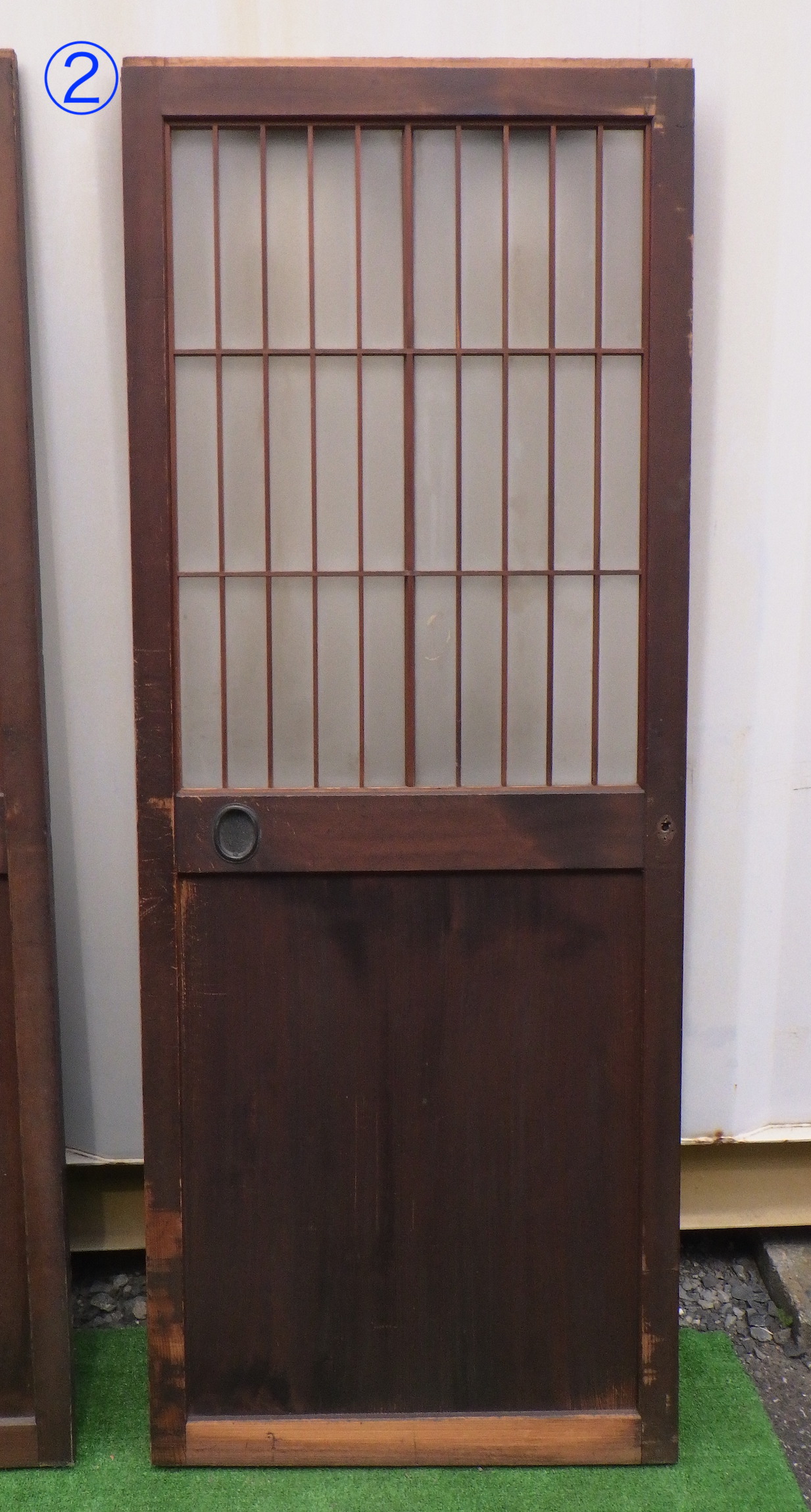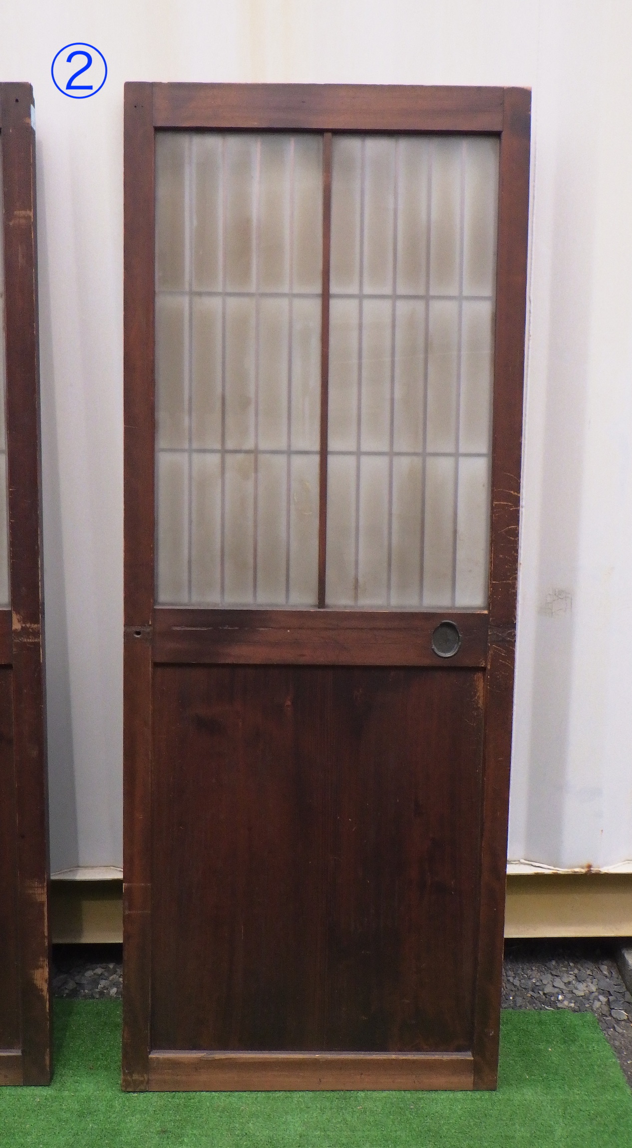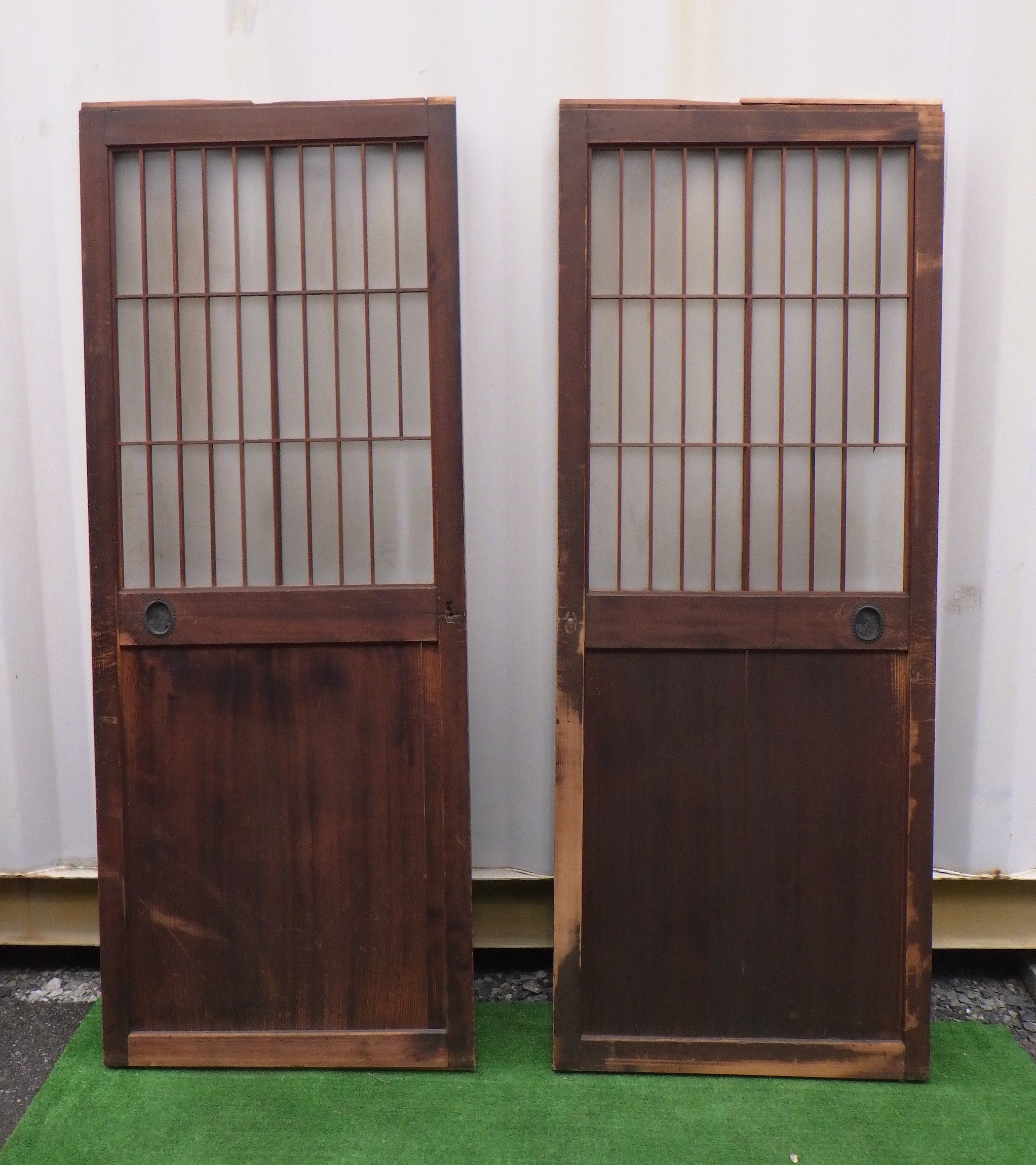 わけあり品。3枚全て鍵はついていません。東京江東区の民家で使われていた戸です。以下個々の詳細となります。 ②は他の3枚と引き手のデザインが異なります。また、片面の引き手は割れている箇所があります。 ③と④は、格子の一部に折れている箇所があります。また腰板に隙間が見られるため、接着が必要です。 もともとどんな建物で使われていたかブログに載せてみましたのでこちらをご覧ください。 ①は完売致しました。